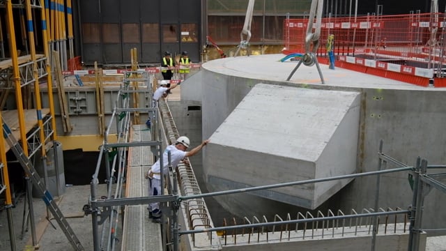 Im Rahmen des Projektes HIF für die ETH Zürich wird auf dem Hönggerberg zur Zeit der Rohbau für eine der weltweit grössten Zentrifugen im Bereich der Geotechnikforschung erstellt. Das unter Terrain realisierte Bauwerk besteht aus einer zweischaligen Konstruktion, wobei ein innerer Betonzylinder als eigentlicher Zentrifugenraum auf vier grossen Schwingungsdämpfern gelagert wird. Die Aufnahmen zeigen, wie das 245 Tonnen schwere Zylinderelement mit einem Spezialkran in das unterirdische Umfassungsbauwerk gehoben wird. Der Einbau der Stahlzentrifuge wird in einem nächsten Schritt erfolgen.
