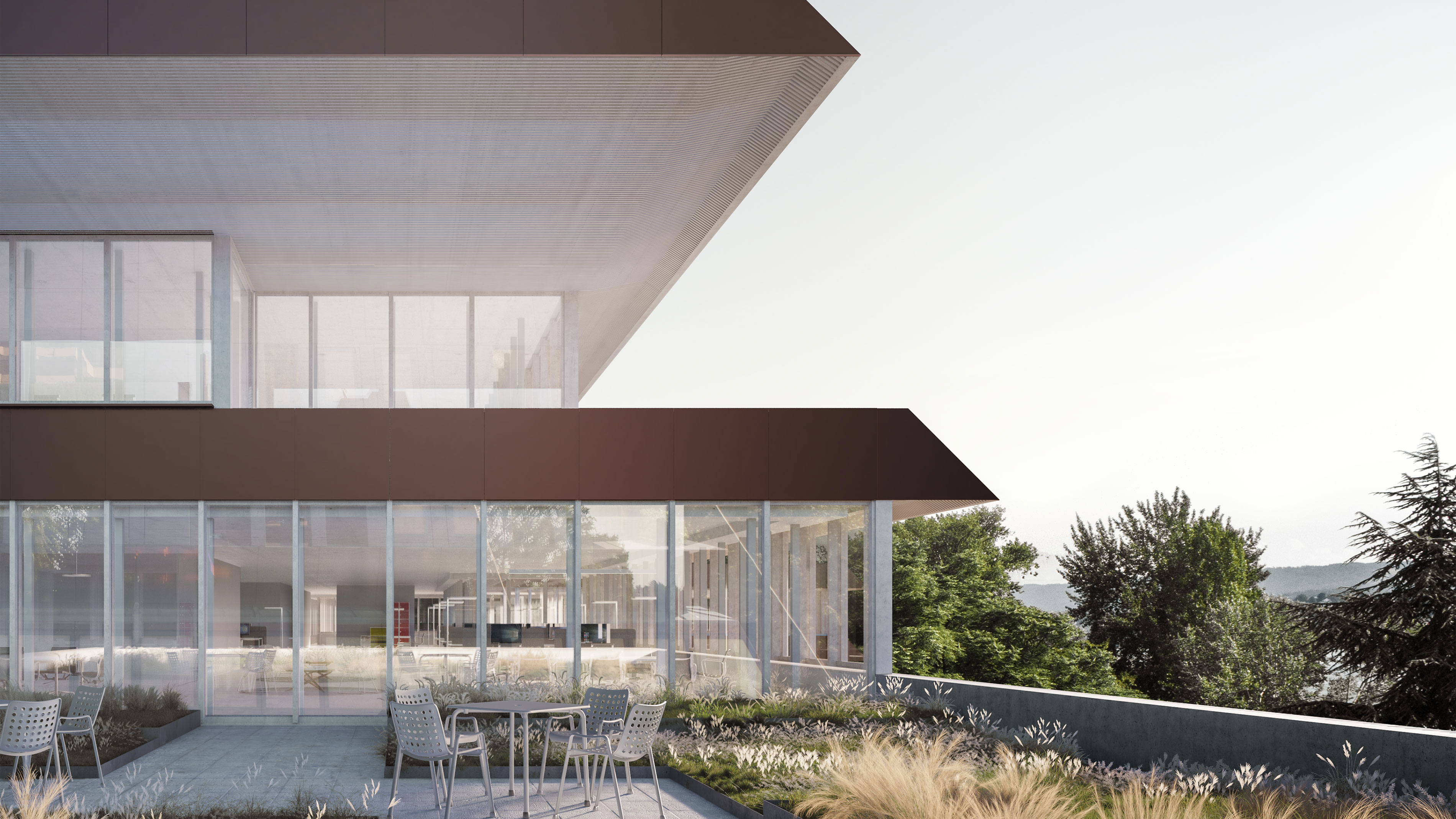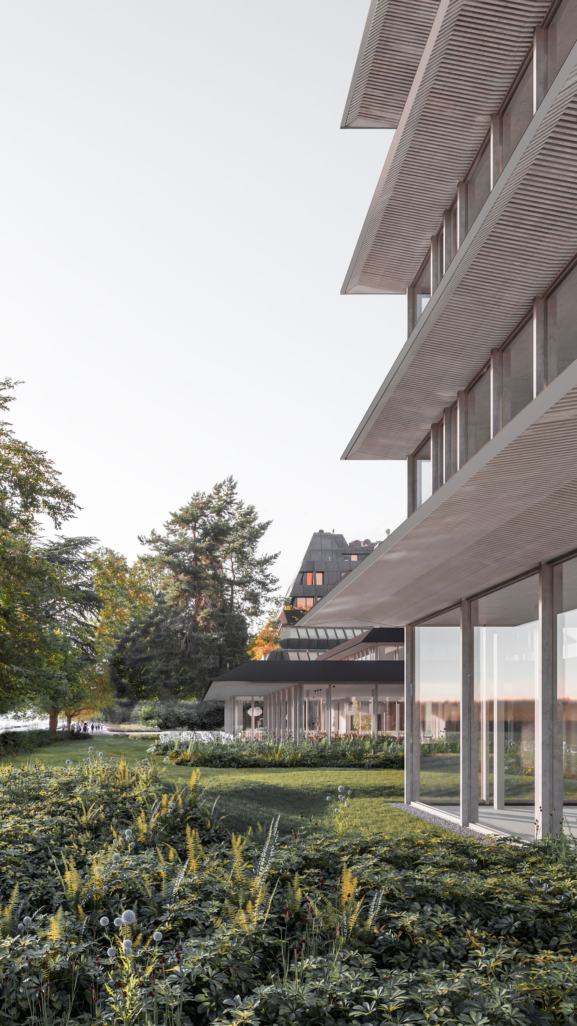 Bei der Neugestaltung des 1974 durch Walther Niehus erstellten Elektrowattgebäudes spielen dessen Bezüge zur grünen Parklandschaft am rechten Zürichseeufer eine wichtige Rolle. Sowohl zur Bellerivestrasse als auch zur Seepromenade präsentiert sich das Erdgeschoss transparent und einladend. Aufgrund der geschichteten Komposition des Baukörpers gibt es grosse Dachterrassen, die eine Fortsetzung des Grünraums in der Vertikalen ermöglichen. Schräg ausgestellte und mit Photovoltaik bestückte Bänder betonen die horizontale Gliederung des Gebäudes. Im Innern erlaubt die Vierteilung der Geschosse eine flexible Single- oder Multi-Tenant-Nutzung.