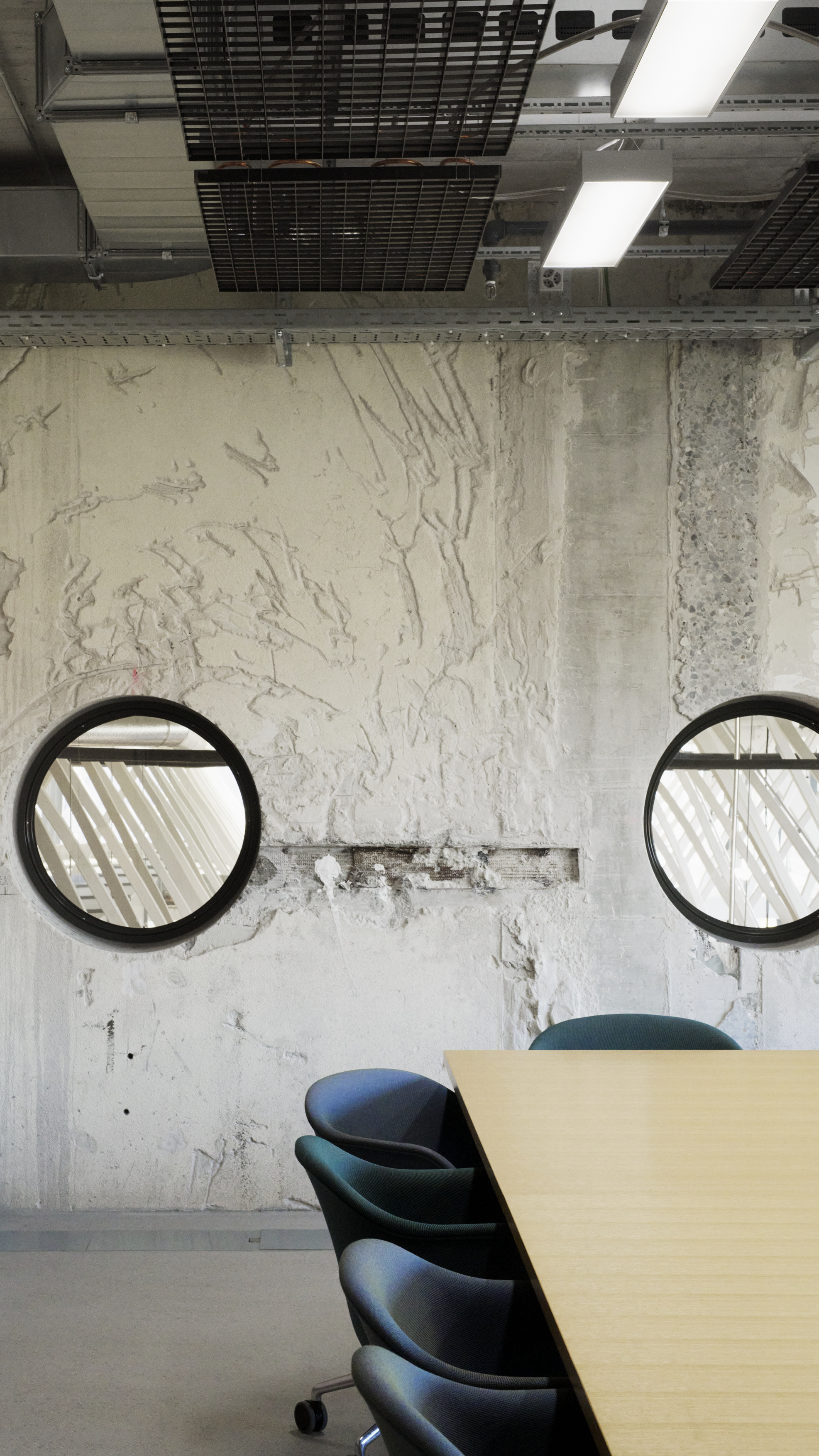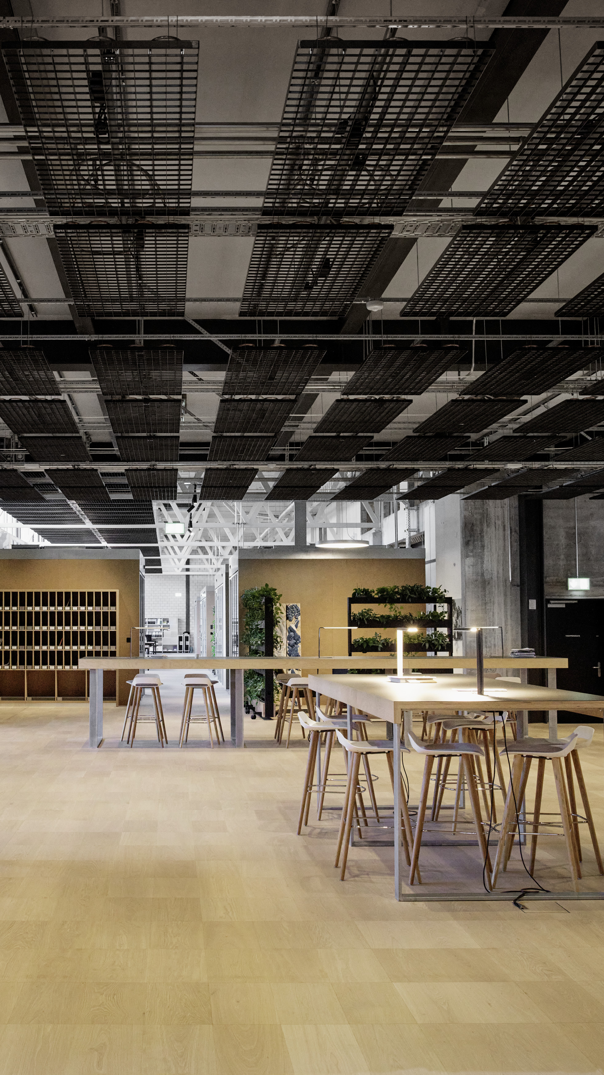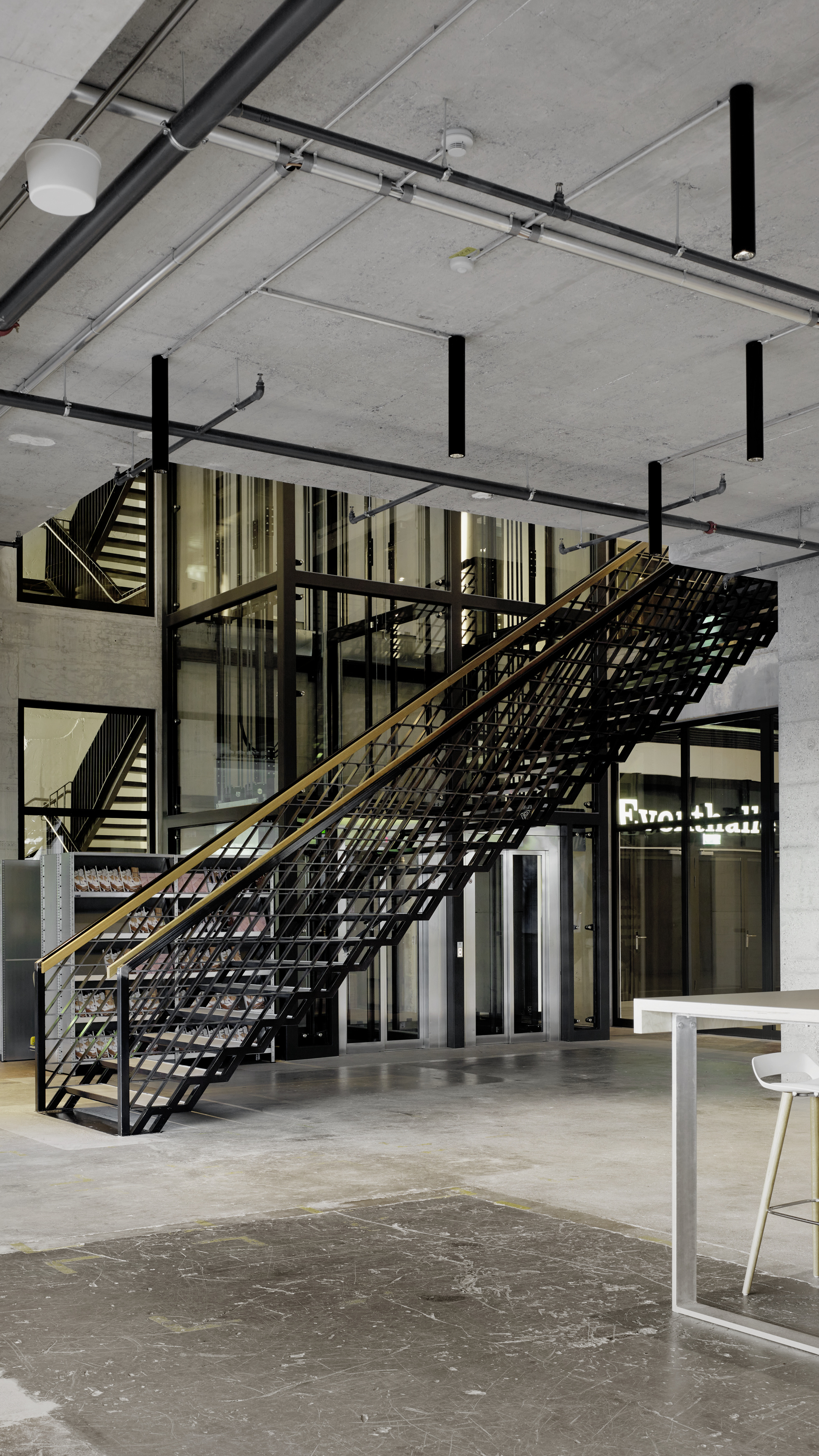 Auf dem ehemaligen Areal des NZZ Druckzentrums befindet sich der neue Business-Hub JED. Die Räumlichkeiten der Firma Halter nehmen Teile der umgebauten Druckerei ein. Den Auftakt bilden die Co-Working-Arbeitsplätze im Erdgeschoss. Eine Stahltreppe zieht die Blicke auf sich und führt zu den Sitzungszimmern im ersten Obergeschoss. Die meisten Arbeitsplätze befinden sich im aufgestockten dritten Obergeschoss. Dieses besteht aus einem kreuzförmigen Grundriss, dessen Mitte zum Treffpunkt wird. In den angrenzenden Bürobereichen bieten massgeschneiderte Boxen Rückzugsorte für Telefonate und Sitzungen. Wie kleine Häuser wirken sie in der grossen Halle und machen daraus einen städtisch anmutenden Ort.