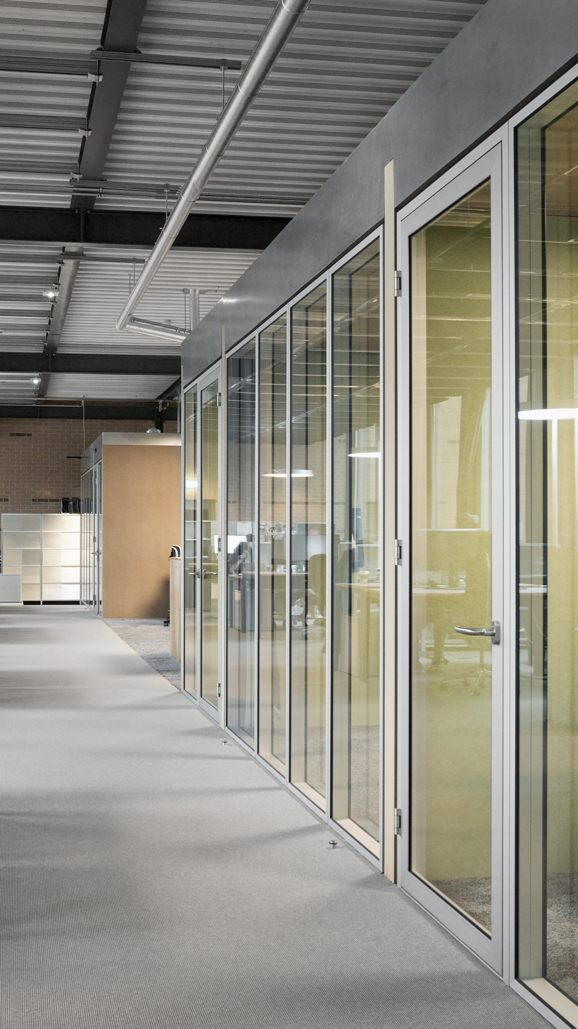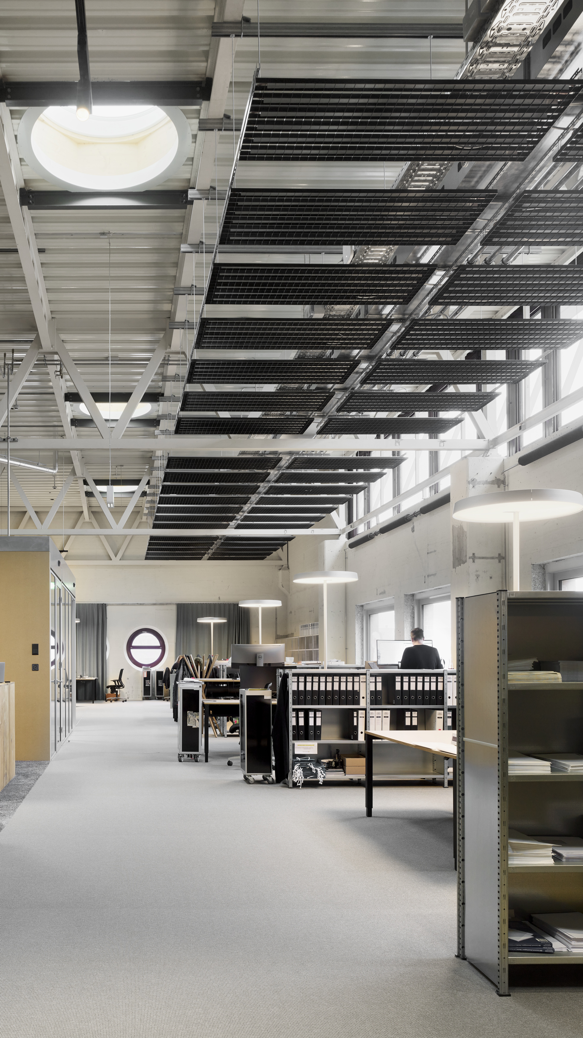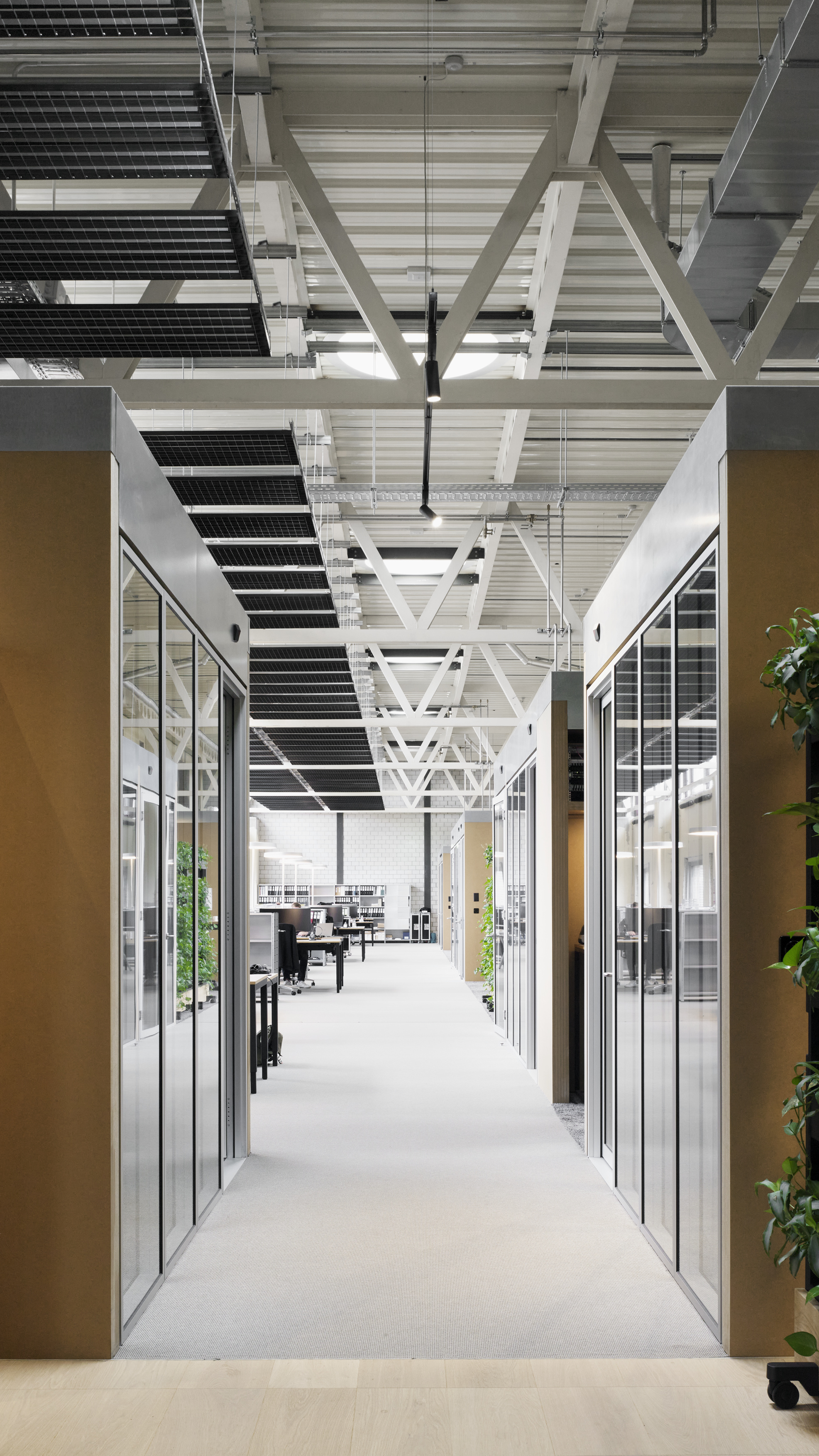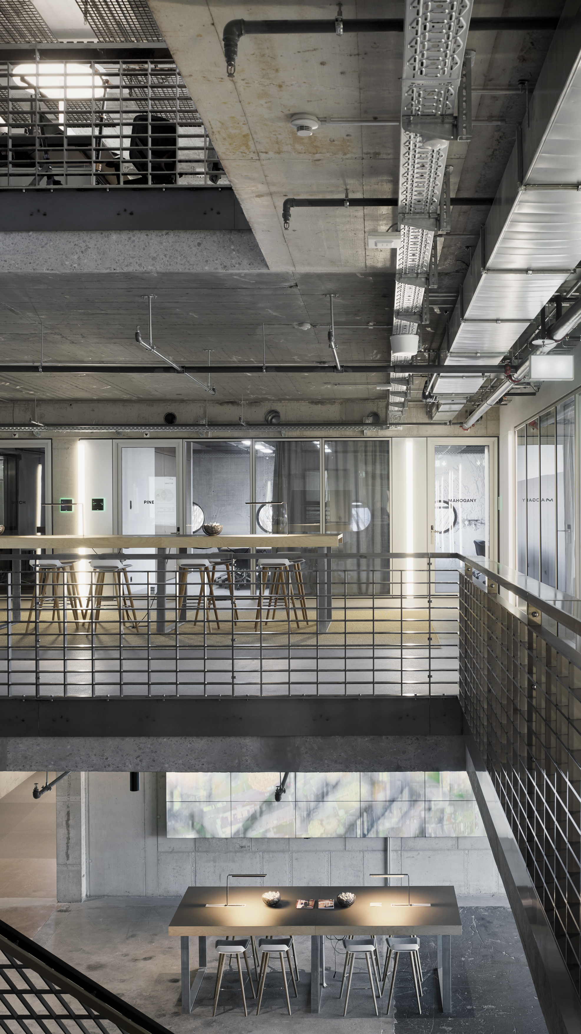 Auf dem ehemaligen Areal des NZZ Druckzentrums befindet sich der neue Business-Hub JED. Die Räumlichkeiten der Firma Halter nehmen Teile der umgebauten Druckerei ein. Den Auftakt bilden die Co-Working-Arbeitsplätze im Erdgeschoss. Eine Stahltreppe zieht die Blicke auf sich und führt zu den Sitzungszimmern im ersten Obergeschoss. Die meisten Arbeitsplätze befinden sich im aufgestockten dritten Obergeschoss. Dieses besteht aus einem kreuzförmigen Grundriss, dessen Mitte zum Treffpunkt wird. In den angrenzenden Bürobereichen bieten massgeschneiderte Boxen Rückzugsorte für Telefonate und Sitzungen. Wie kleine Häuser wirken sie in der grossen Halle und machen daraus einen städtisch anmutenden Ort.
