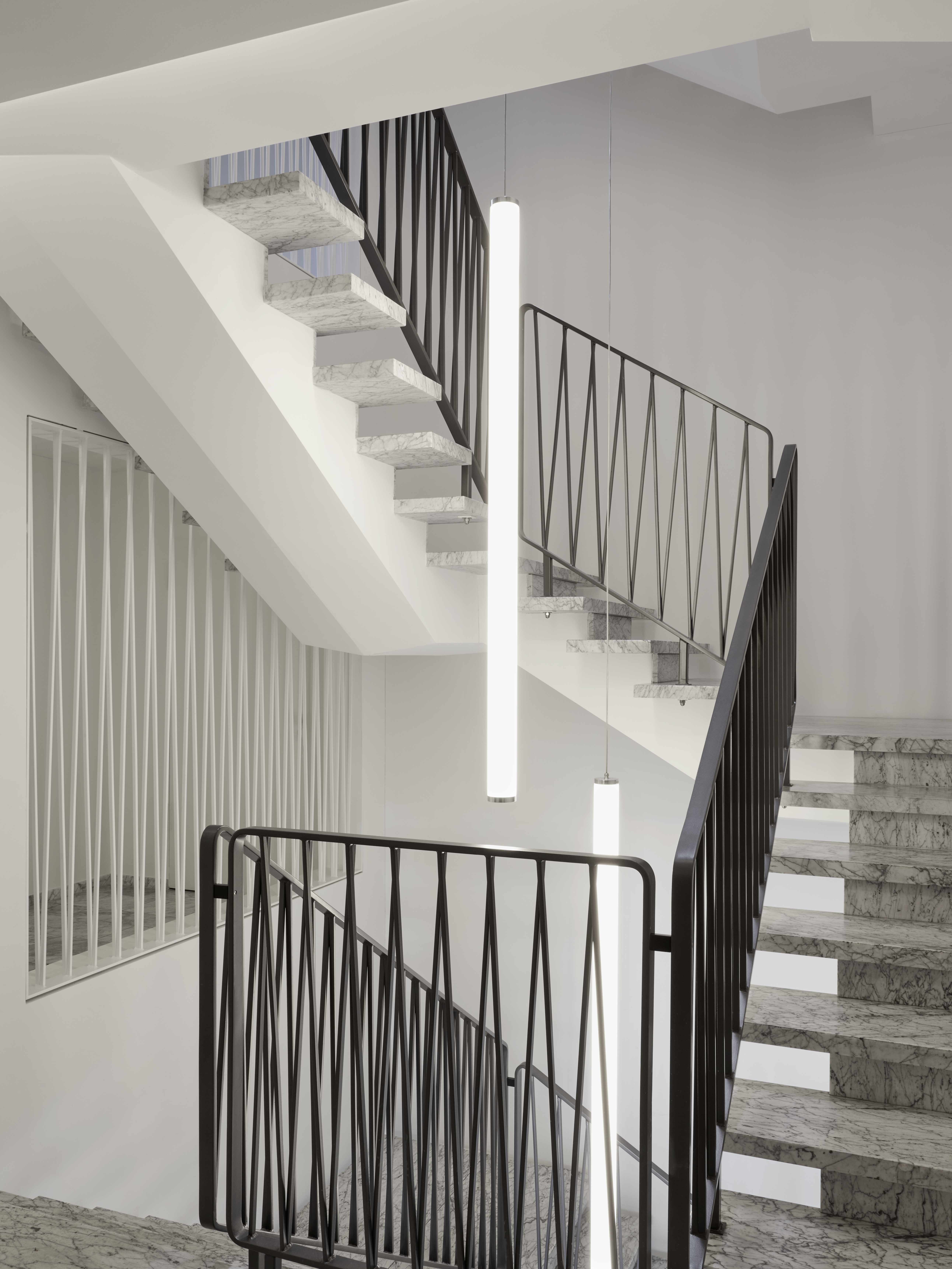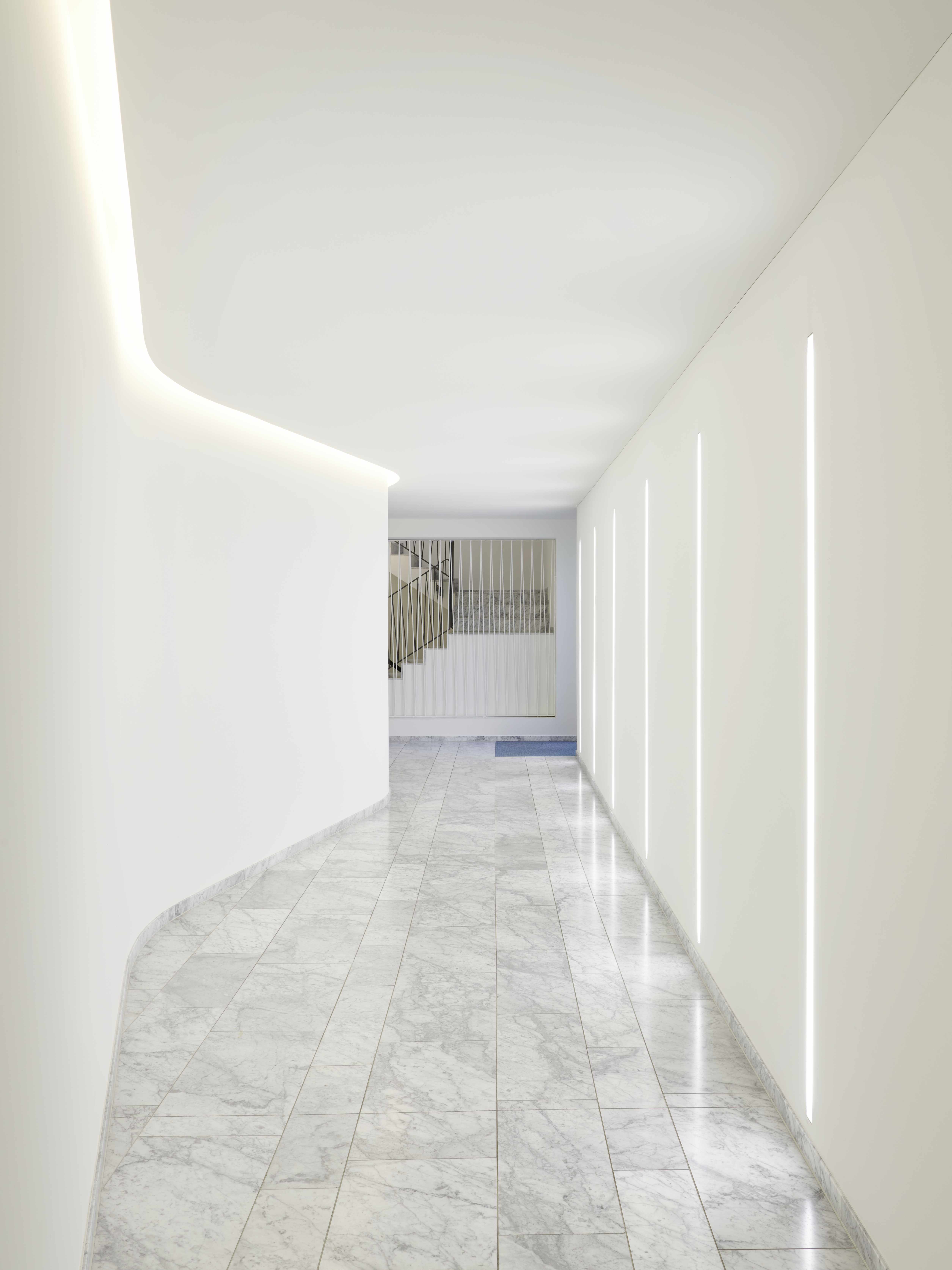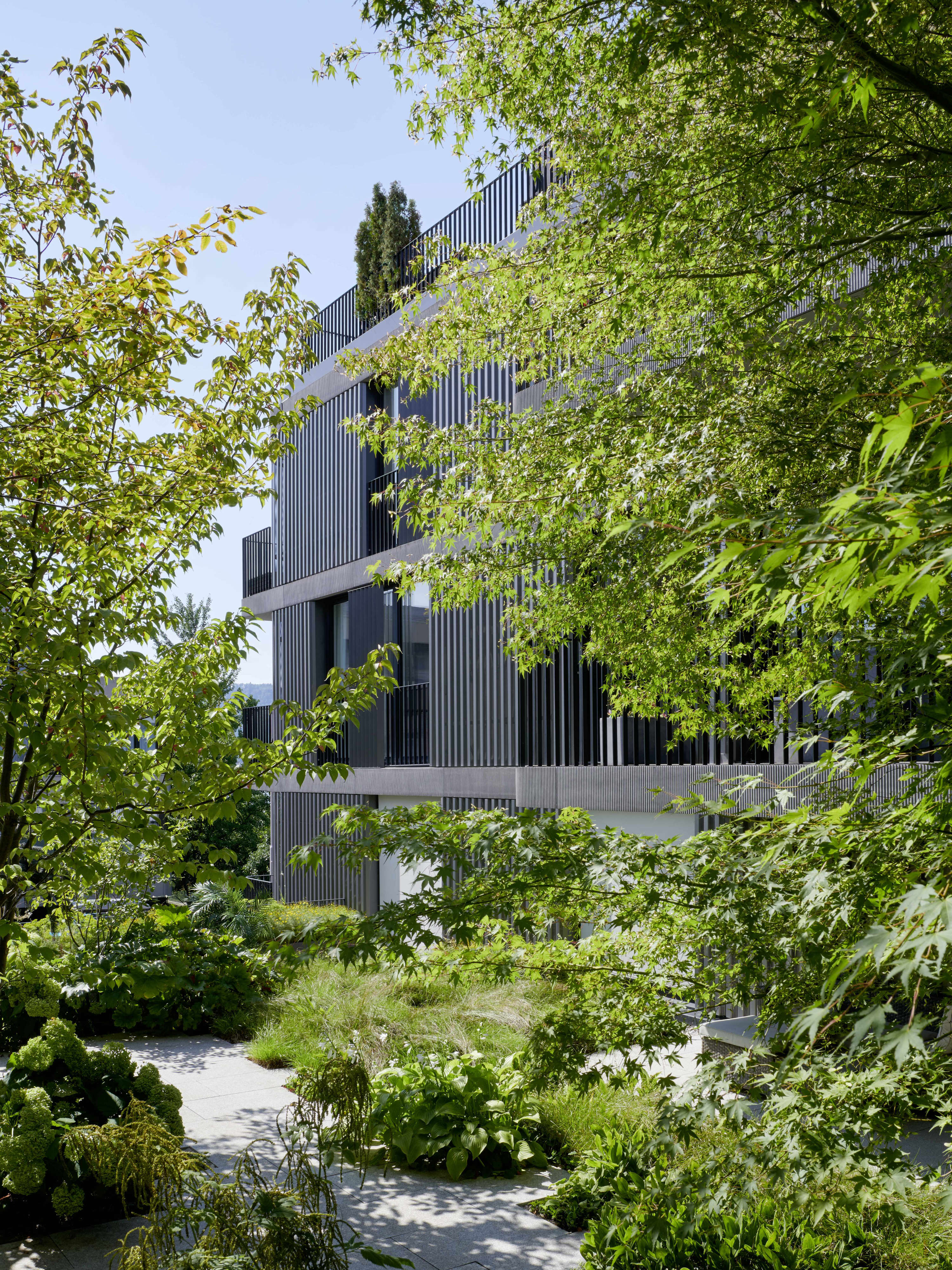 Das ursprüngliche Bürogebäude liegt mitten in einem Wohngebiet. Mit dem Ziel einer langfristig stabilen Ertragssituation beschloss die Bauherrschaft, das Haus in ein Wohngebäude zu transformieren. Die Wohnungsgrössen gingen aus dem Bestand hervor, der sich durch eine L-förmige Grundfigur und die Lage am Hang auszeichnet. An der Zollikerstrasse verfügen die 21 Mietwohnungen über einen gemeinsamen Zugang, auf den eine grosszügige Eingangshalle folgt. Von dort geht es hoch zu den vier Wohngeschossen. Die Fassade wurde komplett erneuert: Grosszügige und raumhohe Fenster sorgen für attraktive Ausblicke in die Umgebung. Neu sind auch die Balkone, die unverkennbar auf die Wohnnutzung verweisen.