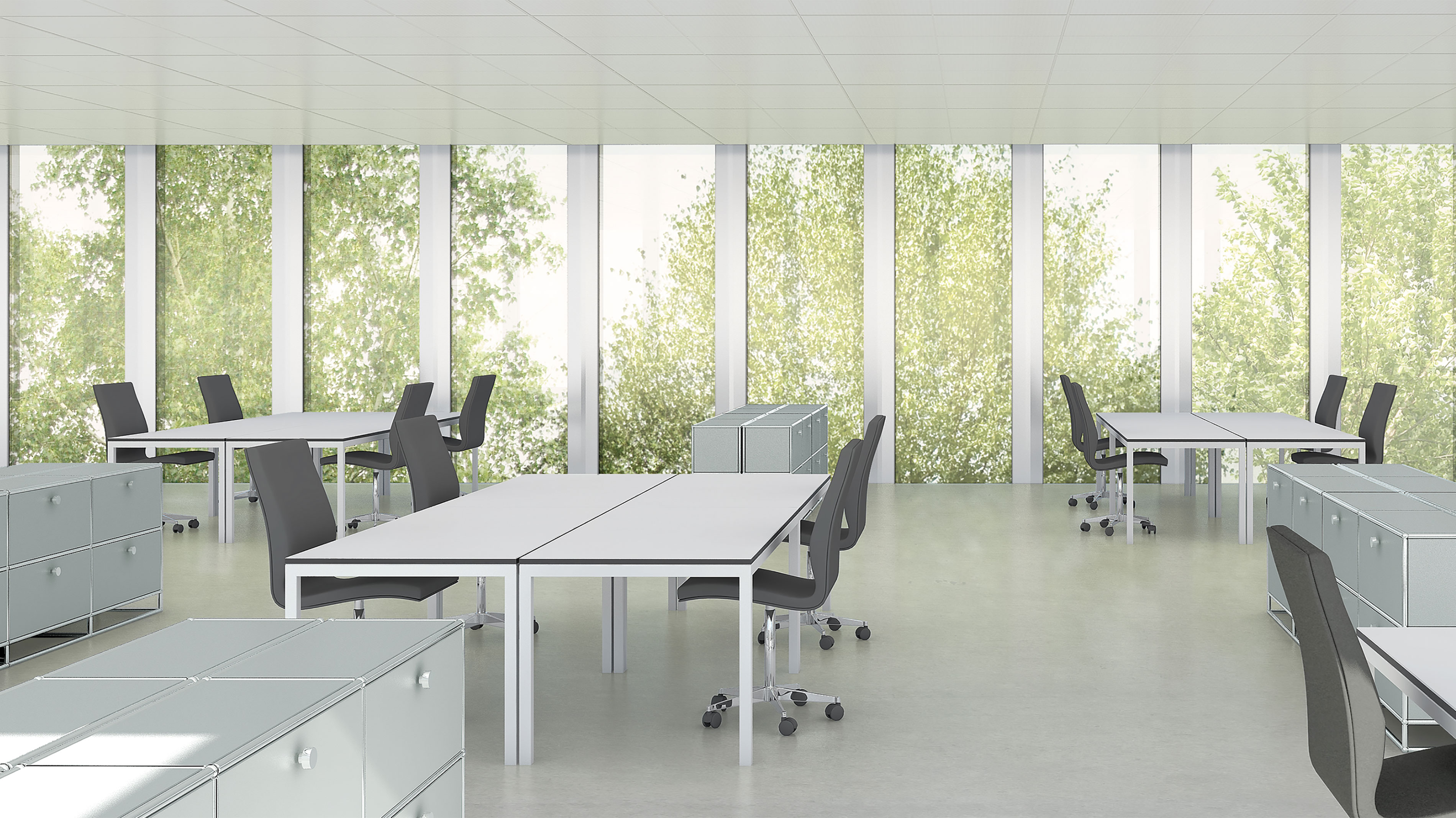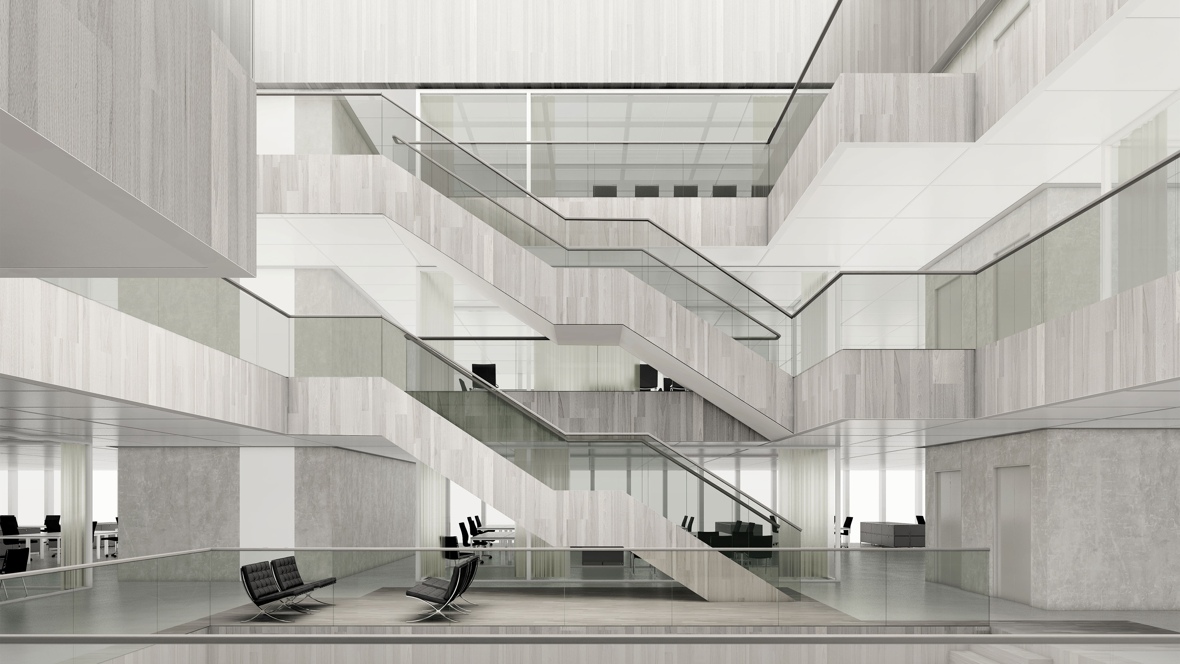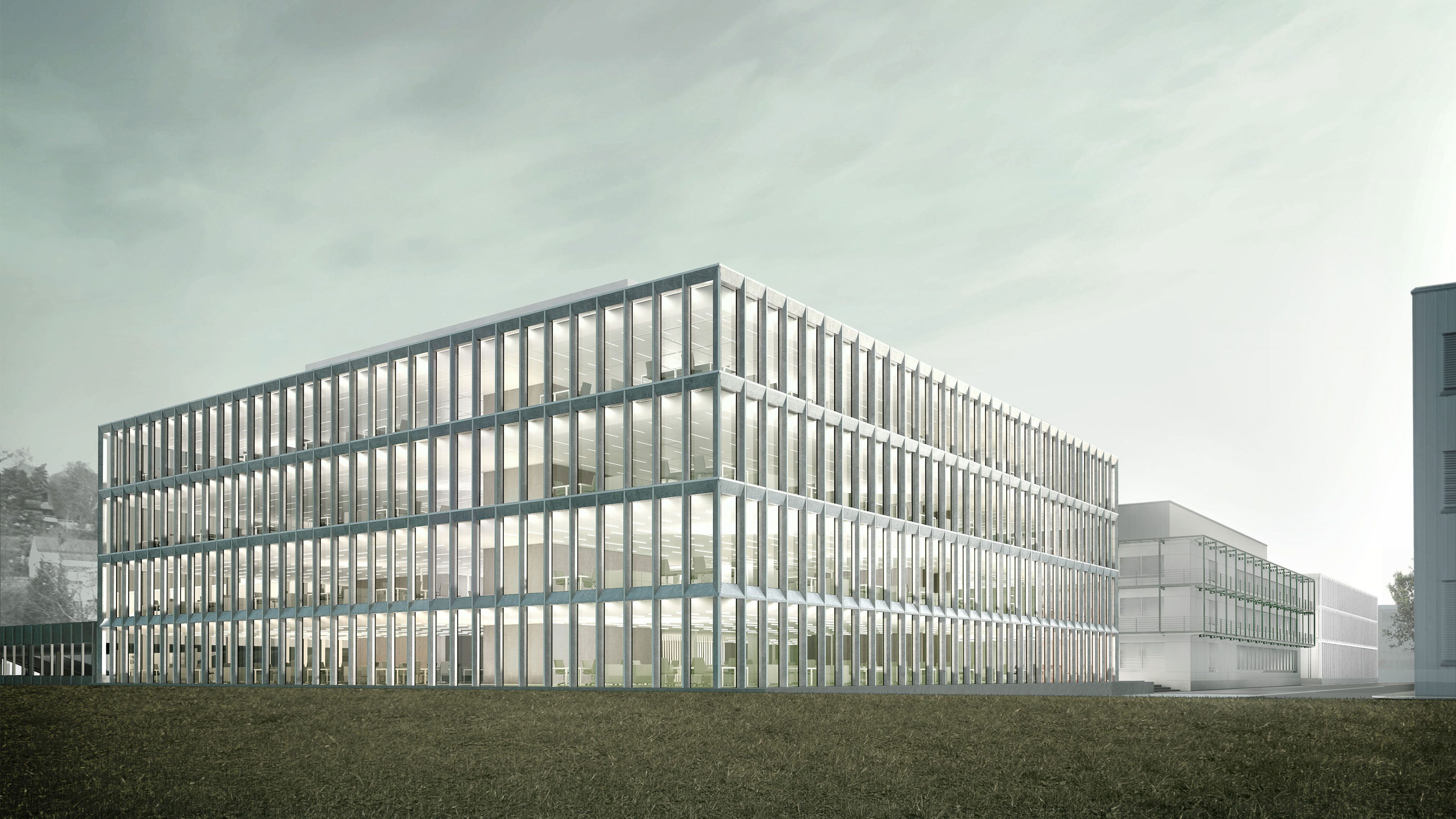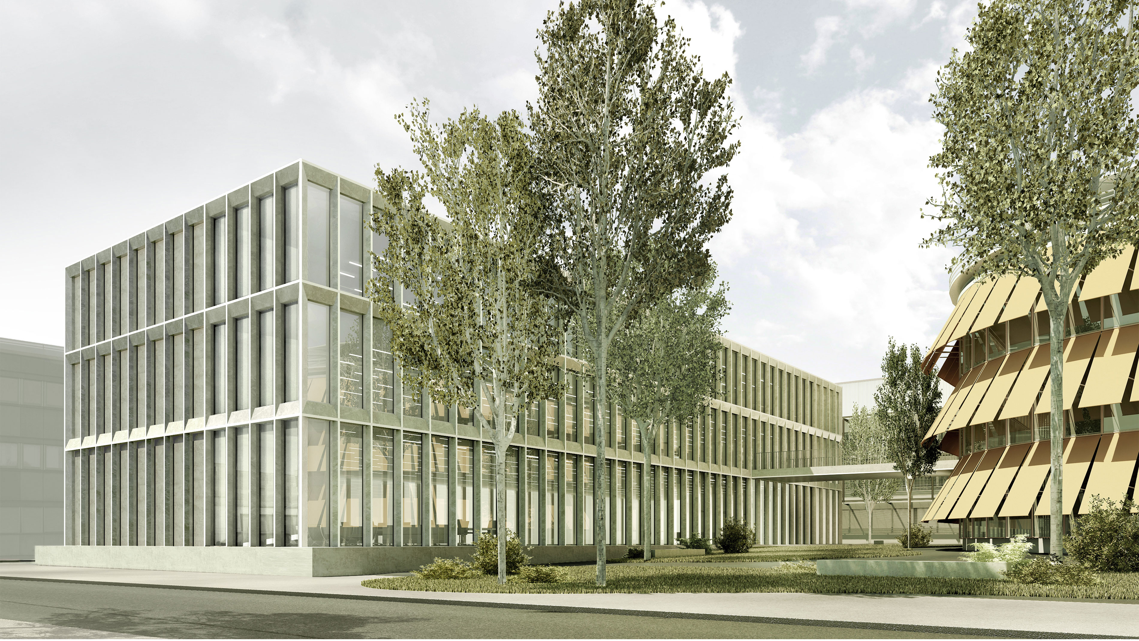 Die Erweiterung besteht aus drei neuen Bausteinen: zwei Büro- und Forschungsbauten und eine unterirdische Einstellhalle. Die beiden Neubauten – einer quadratisch, einer rechteckig – besetzen die südlichen Parzellenecken und nehmen den Bestand in ihre Mitte. Trotz ihrer unterschiedlichen Form basieren sie auf derselben kompositorischen und strukturellen Logik. Beide verfügen über eine tragende Fassade und über grosse, stützenfreie Arbeitszonen. Das garantiert eine hohe Flexibilität bei der räumlichen Unterteilung und Betriebsorganisation. Ähnlich dem Bestandsbau verfügt das quadratische Gebäude in seiner Mitte über ein grosszügiges Atrium, das sich in Form einer Tribüne bis ins Untergeschoss erstreckt.