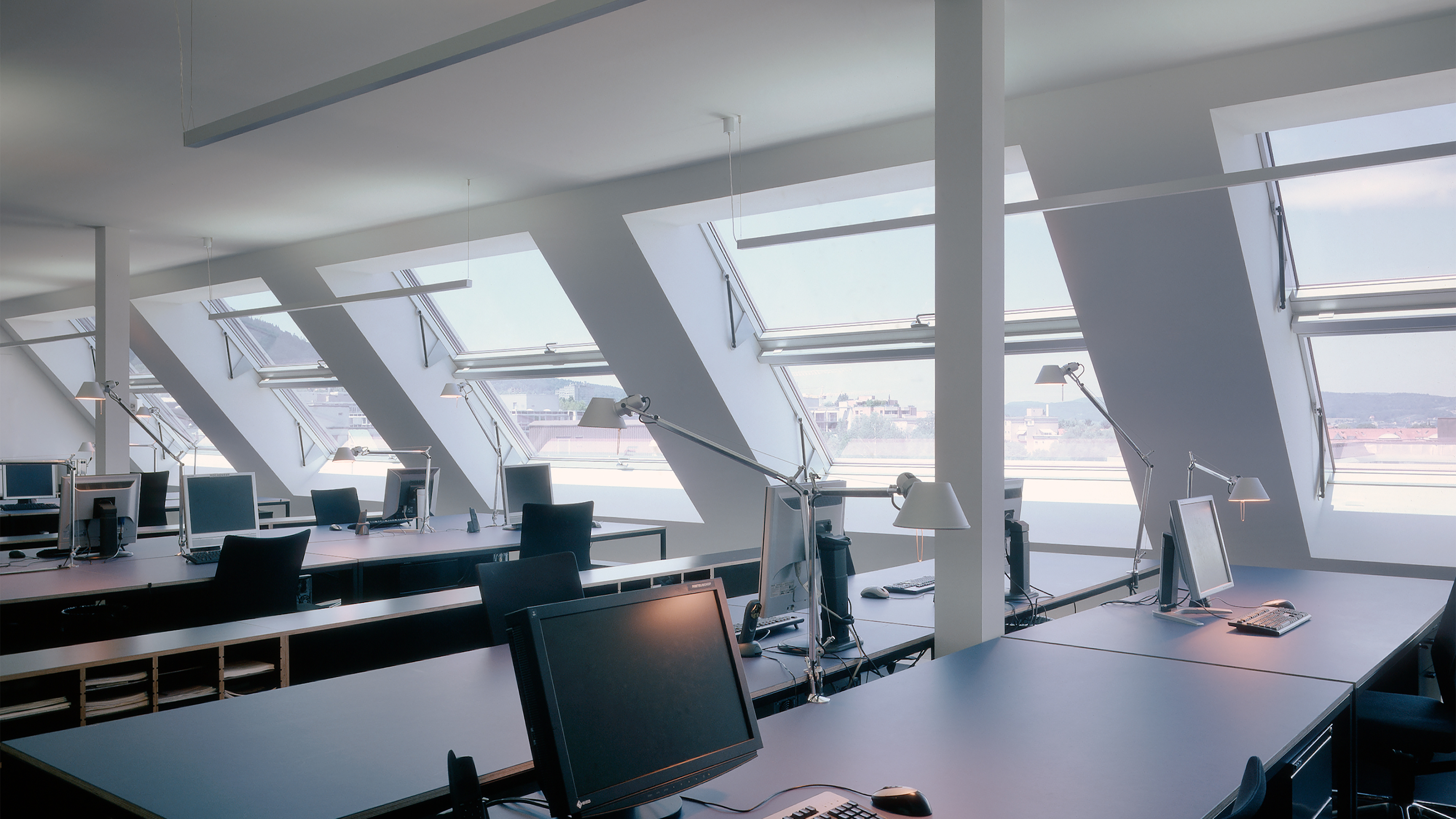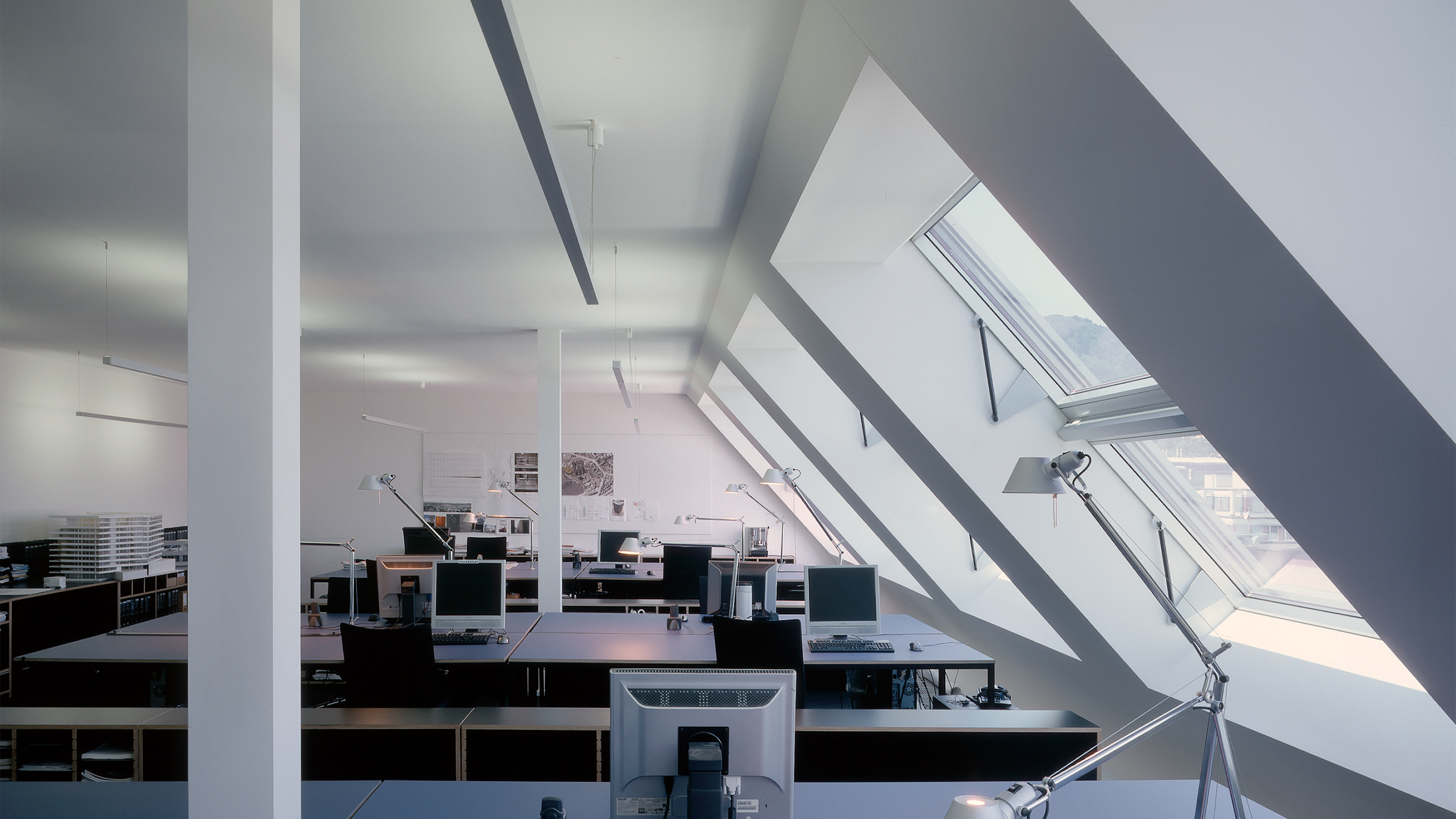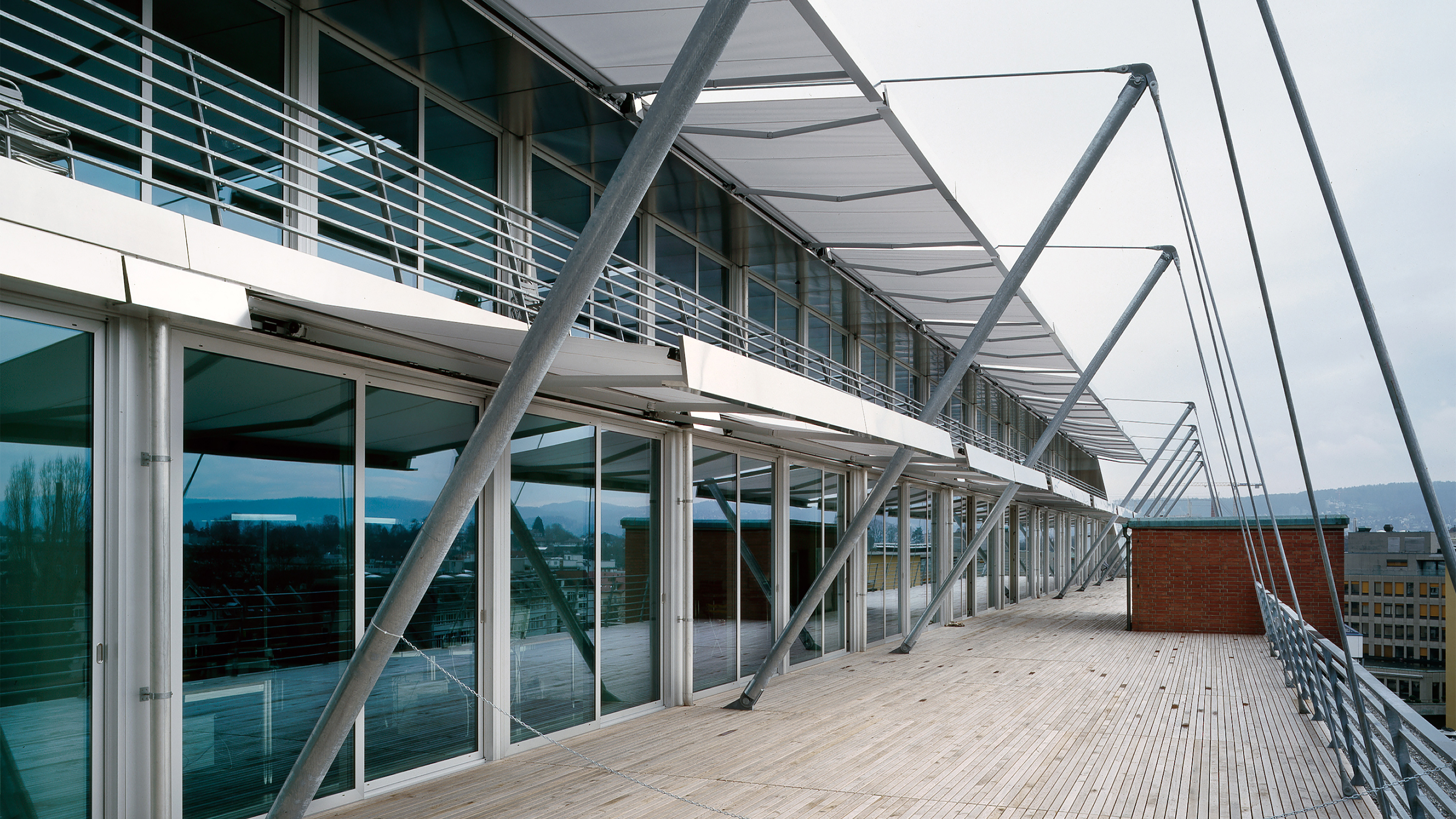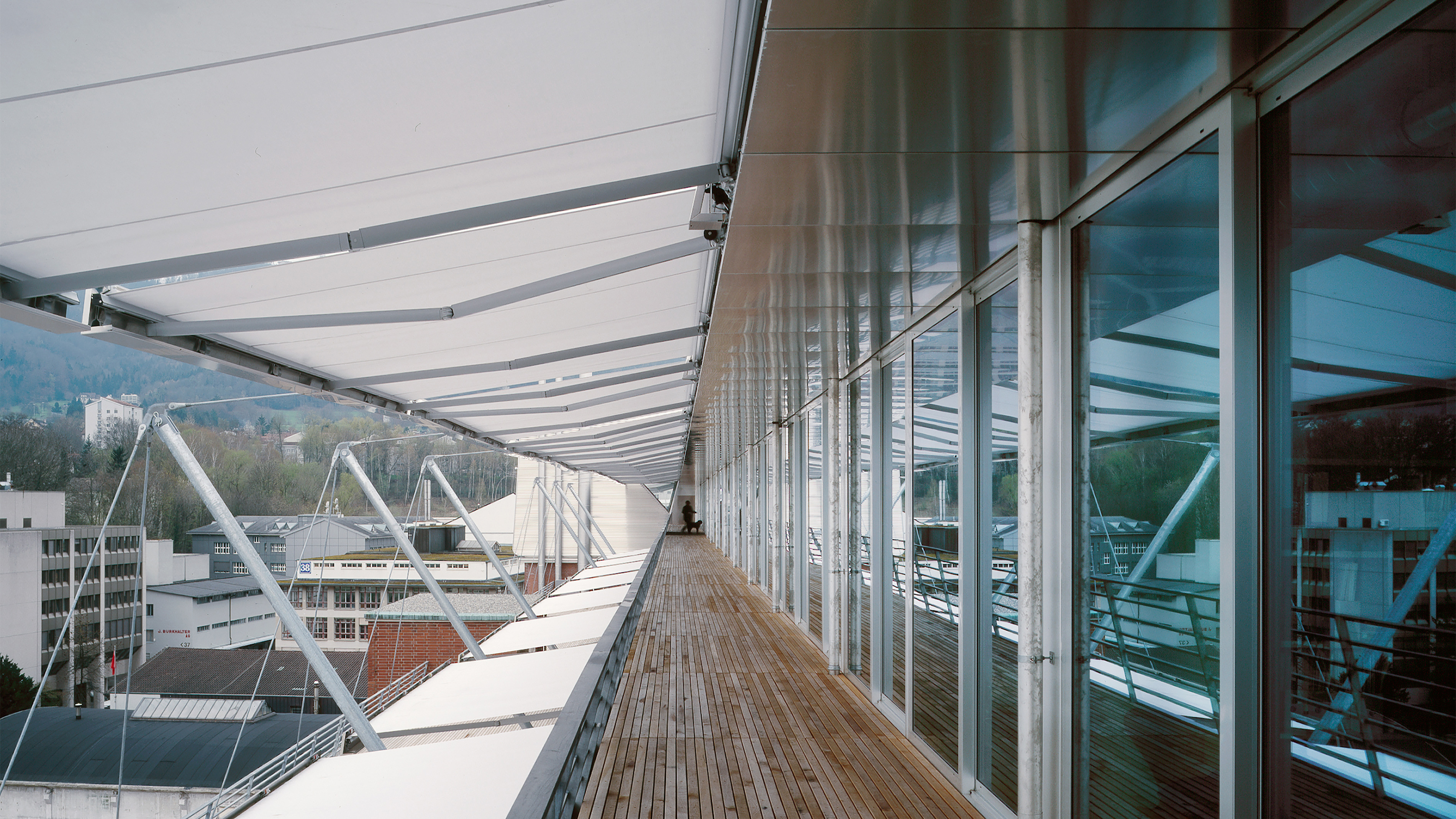 Basis des markanten Gebäudes ist ein Lagerhaus aus den 1920er-Jahren, ein hundert Meter langer, viergeschossiger Backsteinbau. Die zweigeschossige Aufstockung kragt im Norden über der Strasse aus und weicht im Süden von der Fassadenflucht zurück. Dort schwebt eine lange Terrasse über dem bestehenden Flachdach, ohne dieses zu belasten. Fein gewelltes Aluminiumblech verleiht der Aufstockung aus Holz einen industriellen Charakter. Zusammen mit den schrägen Fassadenflächen und den gerundeten Untersichten macht die silberne Verkleidung aus dem Aufbau eine einprägsame Grossform. Der Supertanker ist ein Identifikationsmerkmal in der Binz, einem Quartier, das sich stark wandelt.