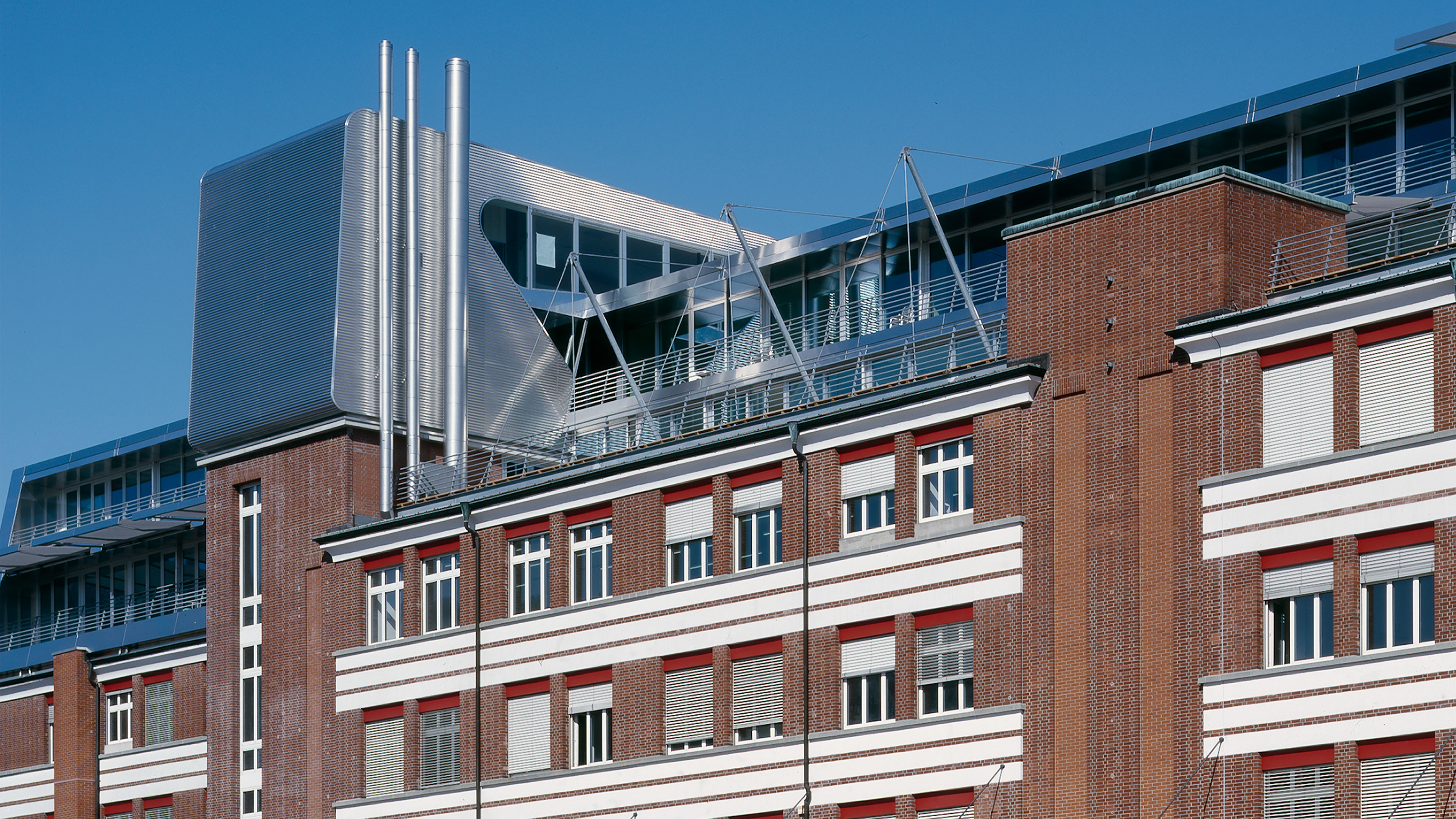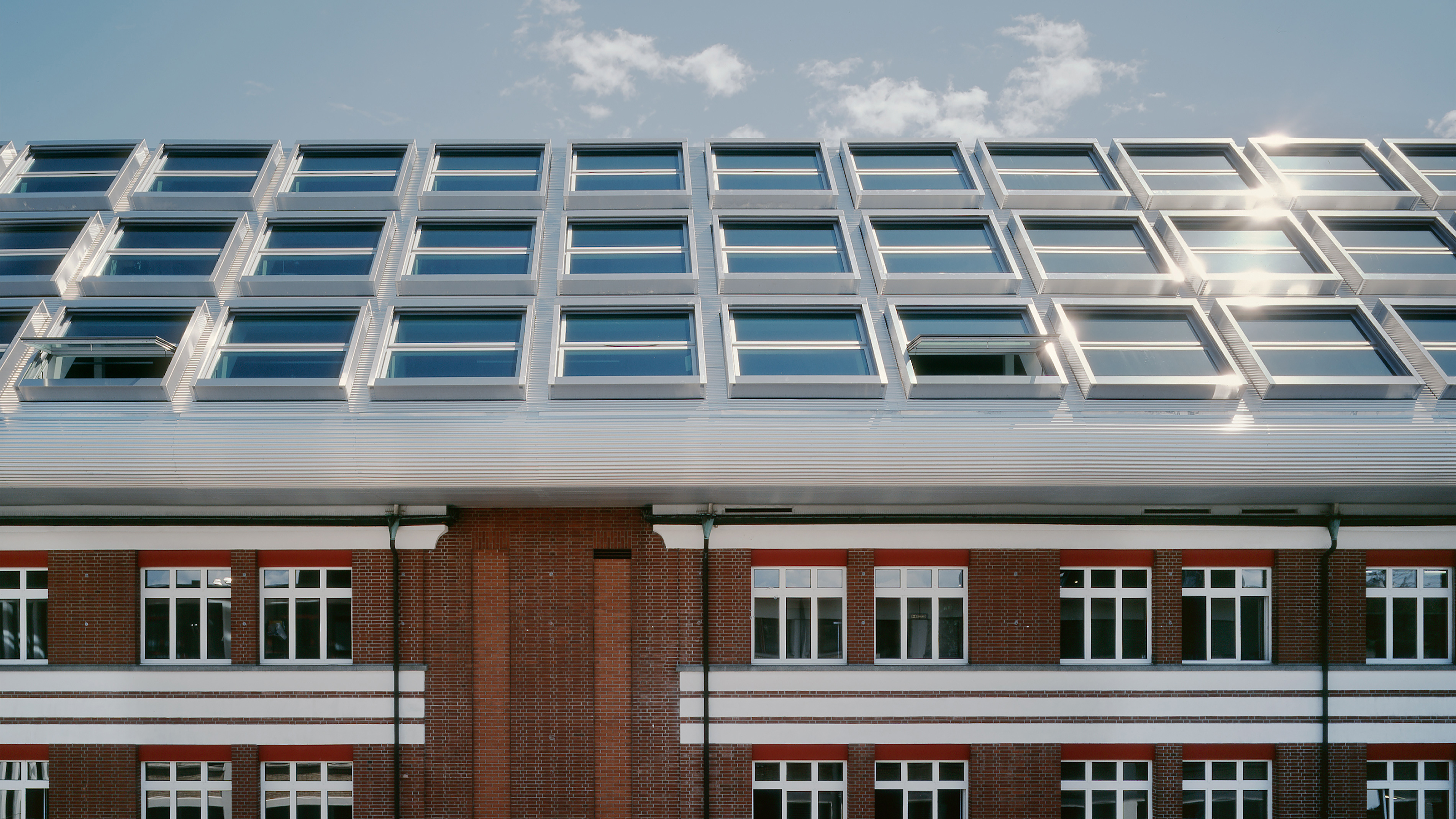Für die Aufstockung des ehemaligen Lagerhauses galt es eine Form zu finden, die sich selbstsicher mit dem starken Charakter des bestehenden roten Backsteinbaus aus den dreissiger Jahren verbindet.