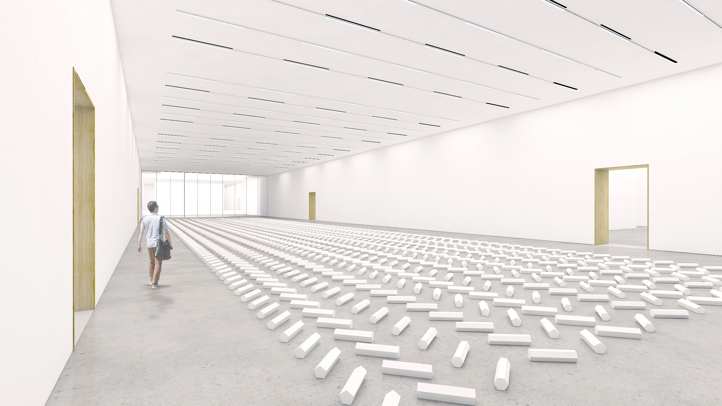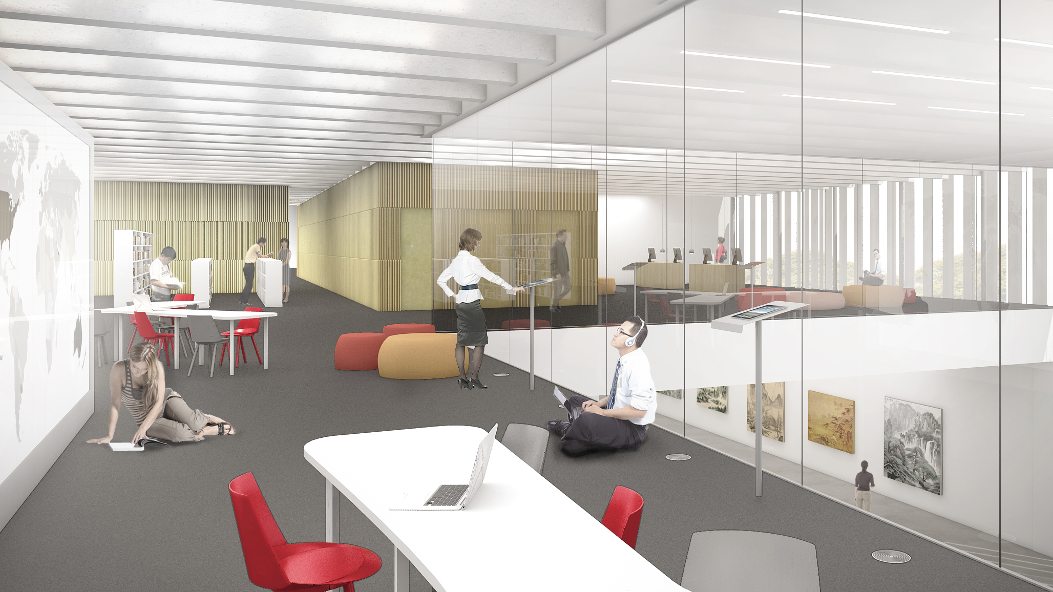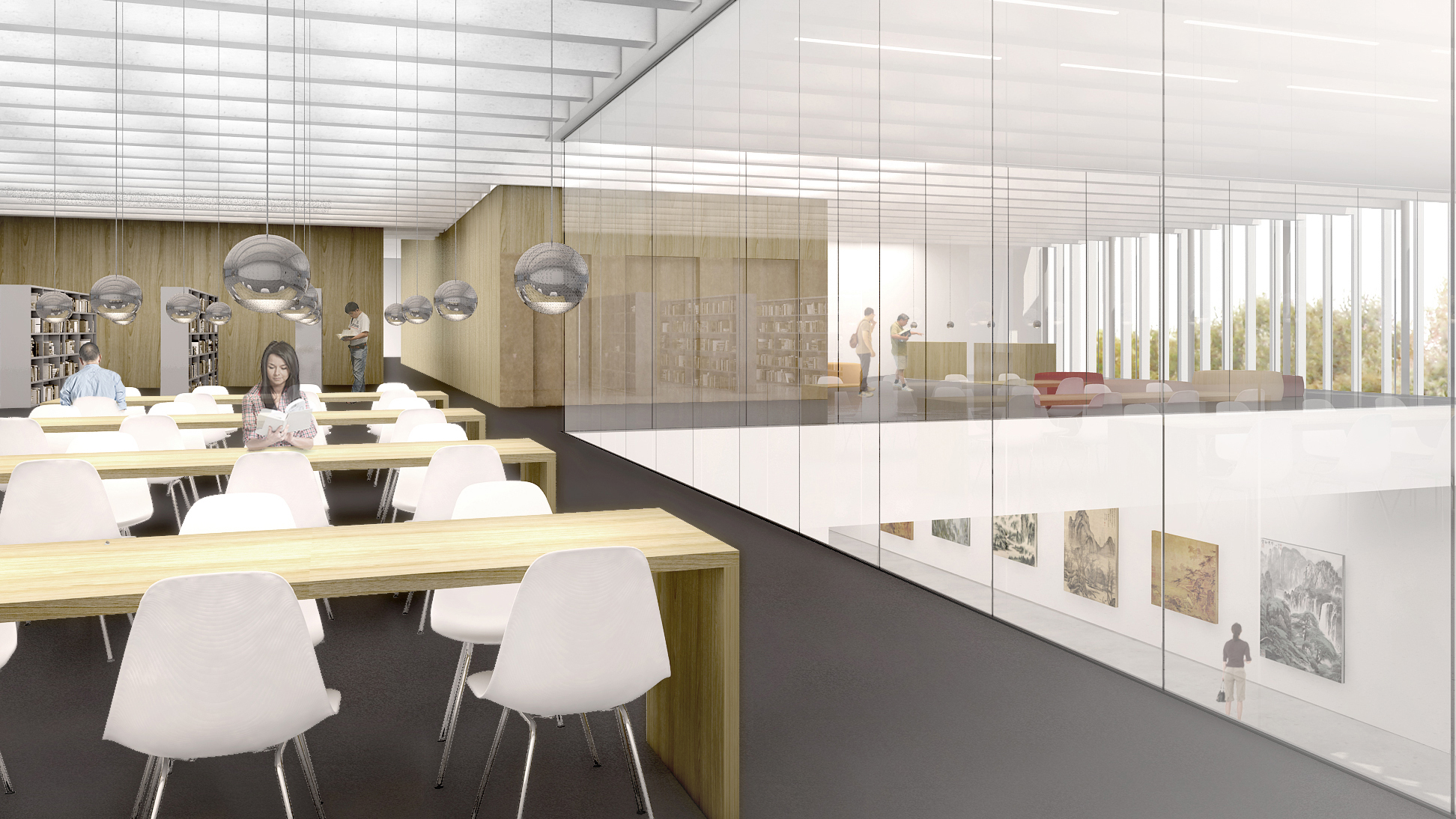In einer Art Doppelhelix sind die Räume der beiden Institutionen ineinander verwoben. Auf ihrem Weg nach oben umrunden die Museumsbesucher das Gebäude vollständig. Begegnungsorte mit öffentlichem Charakter sind Teil des Rundgangs entlang der Fassade. Die Erschliessung der Bibliothek im Innenhof bildet den zweiten Strang der Doppelhelix. Auf der Empfangsebene im zweiten Geschoss verschmelzen die beiden Nutzungen miteinander.