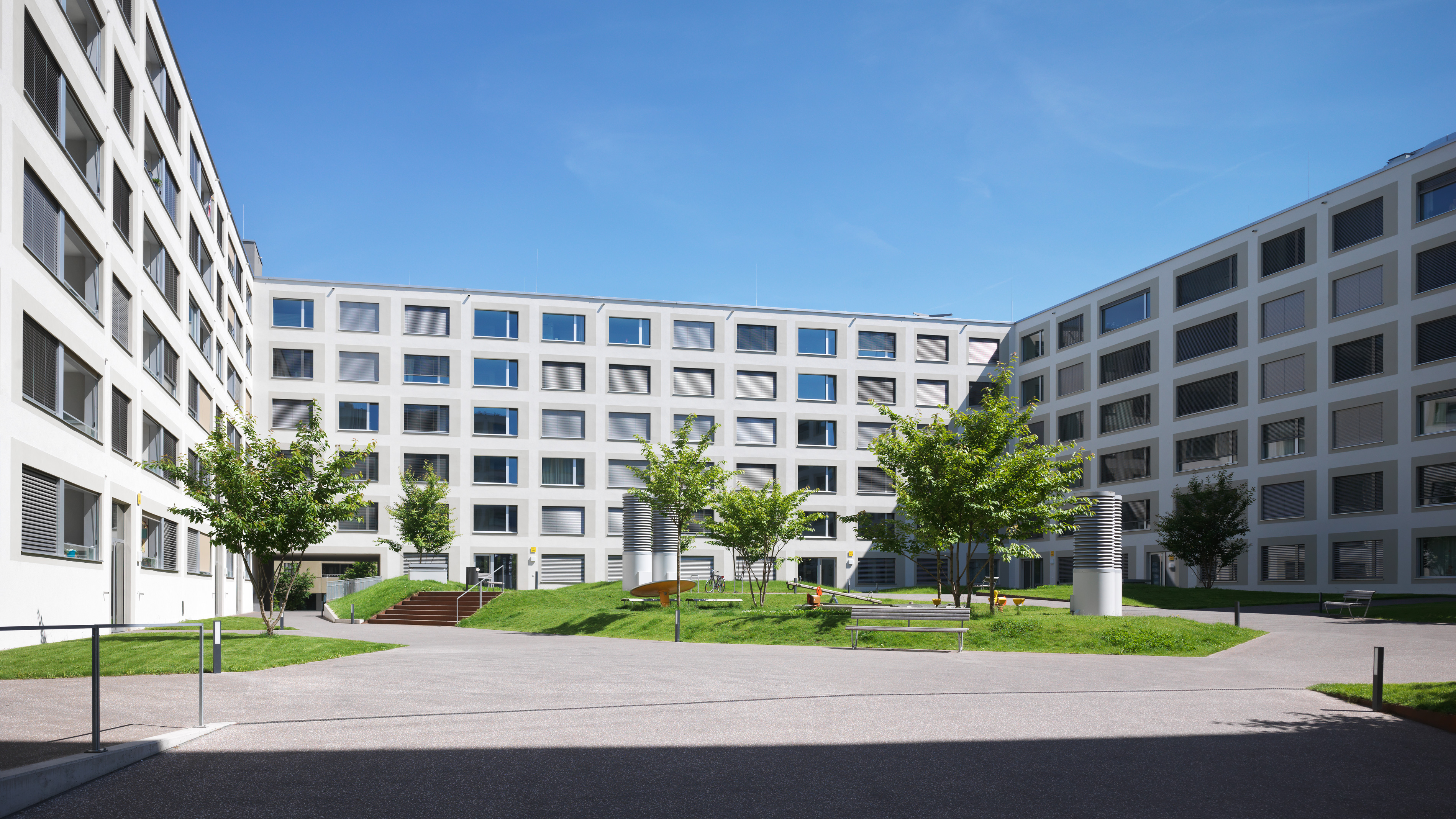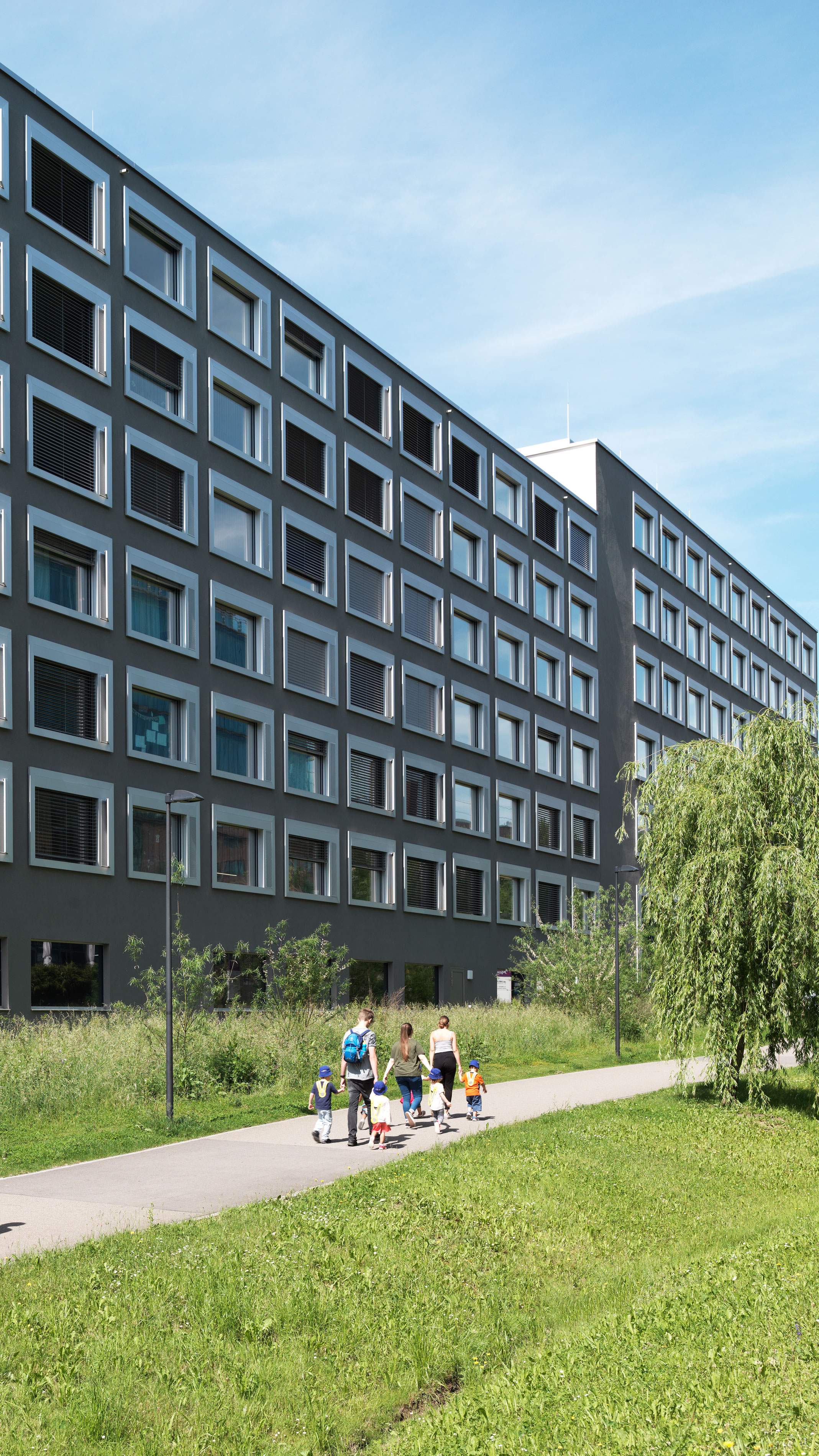 Im Quartierplan Glattpark ist klar formuliert, dass es Blockrandbebauungen und miteinander vernetzte Aussenräume sind, die diesen Ort prägen. Die Überbauung an der Lindbergh-Allee vereint Wohnen, Dienstleistung und Gewerbe. Zwei Innenhöfe strukturieren den Gebäudekörper. Der kleinere bringt Licht in die rundherum angeordneten Büros. Der grössere, begrünte Hof ist Ankunftsort für die Bewohnerinnen. Die effizienten Wohnungsgrundrisse richten sich an Ein- oder Zweipersonenhaushalte. Durchgehende Wohnzimmer mit Loggien auf beiden Seiten vermitteln Grosszügigkeit und erlauben den Blick auf den Hof ebenso wie auf die Umgebung. Eine modulare Fassade verleiht dem Baukörper eine rundum wiedererkennbare Erscheinung.