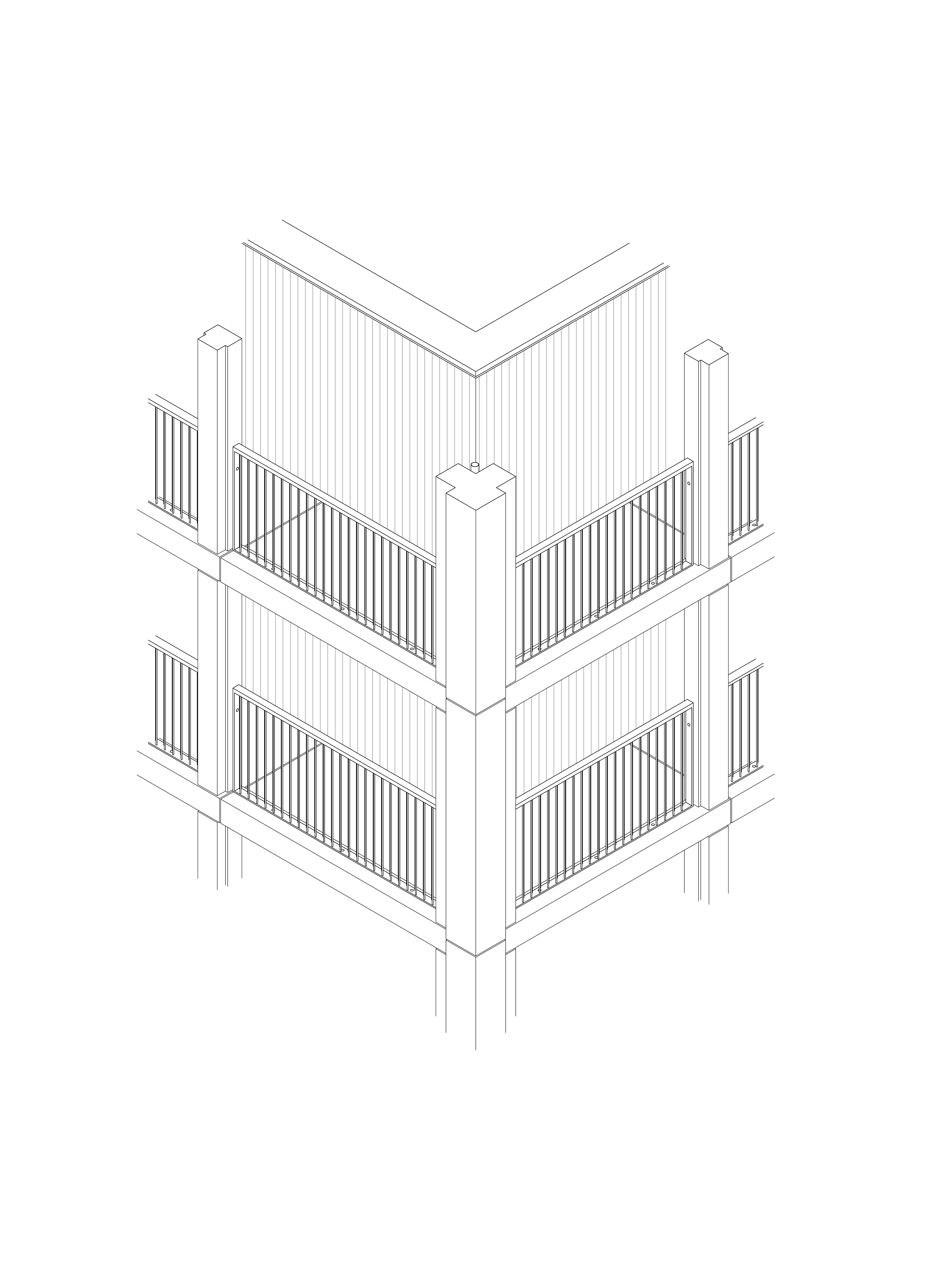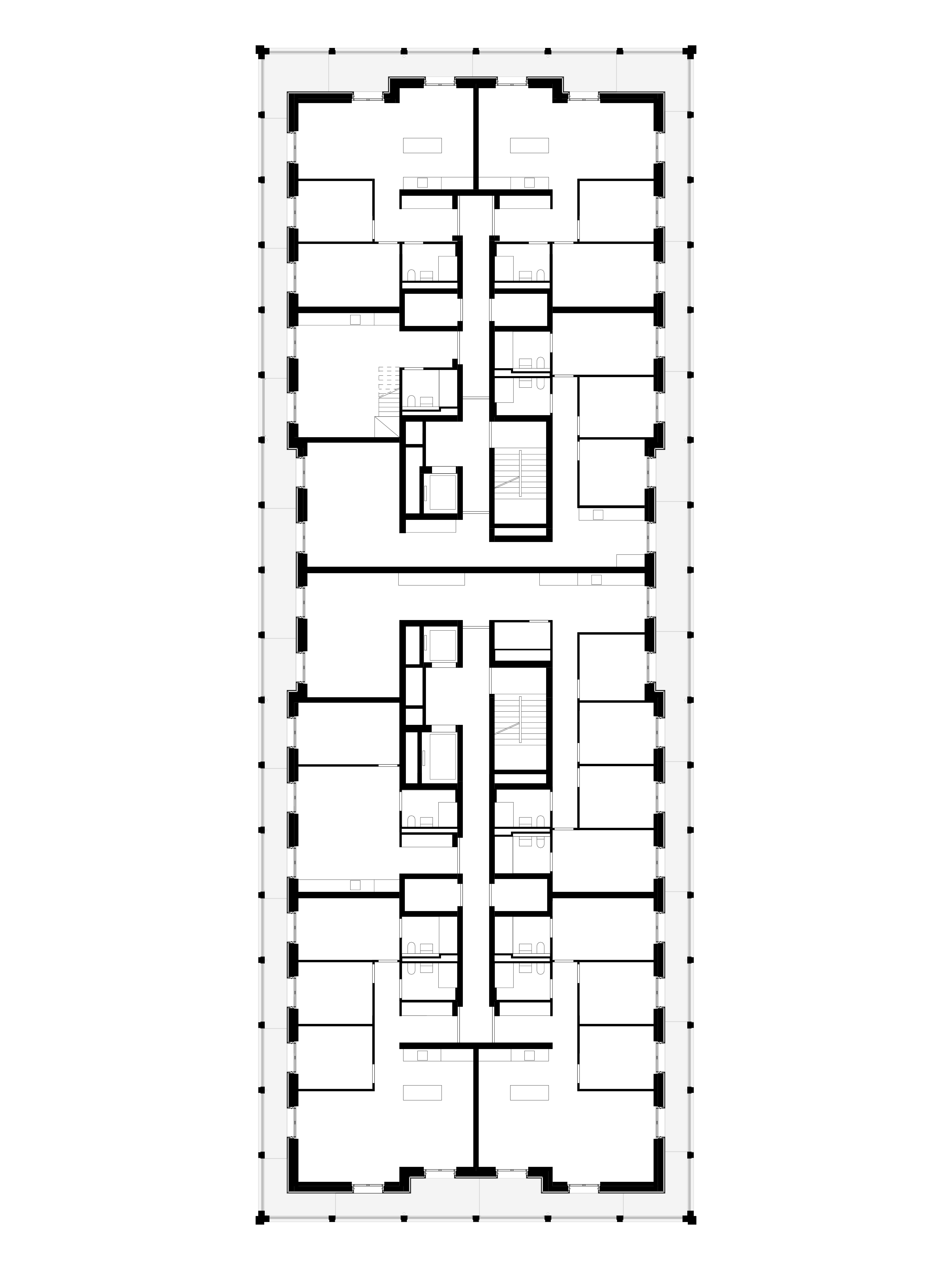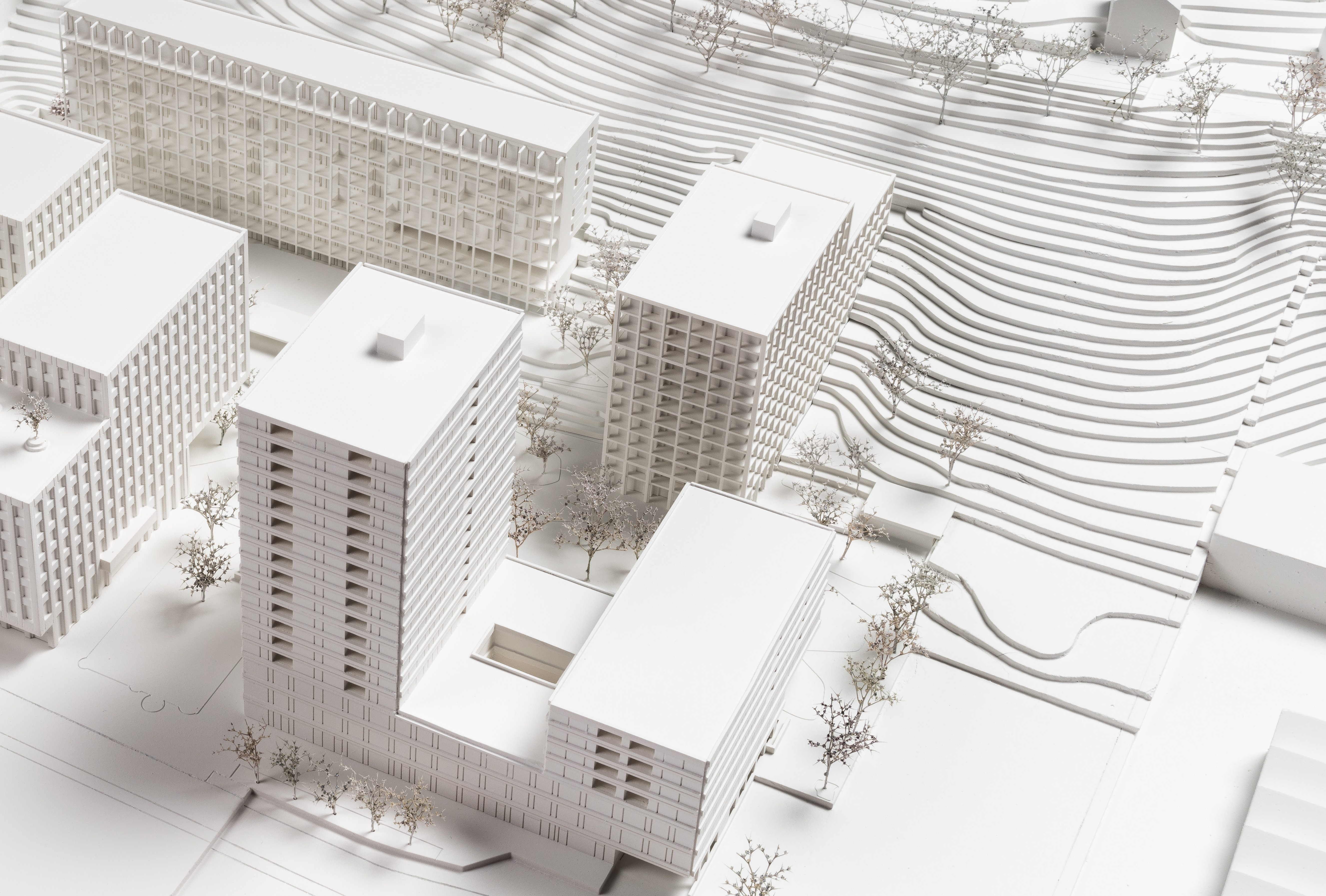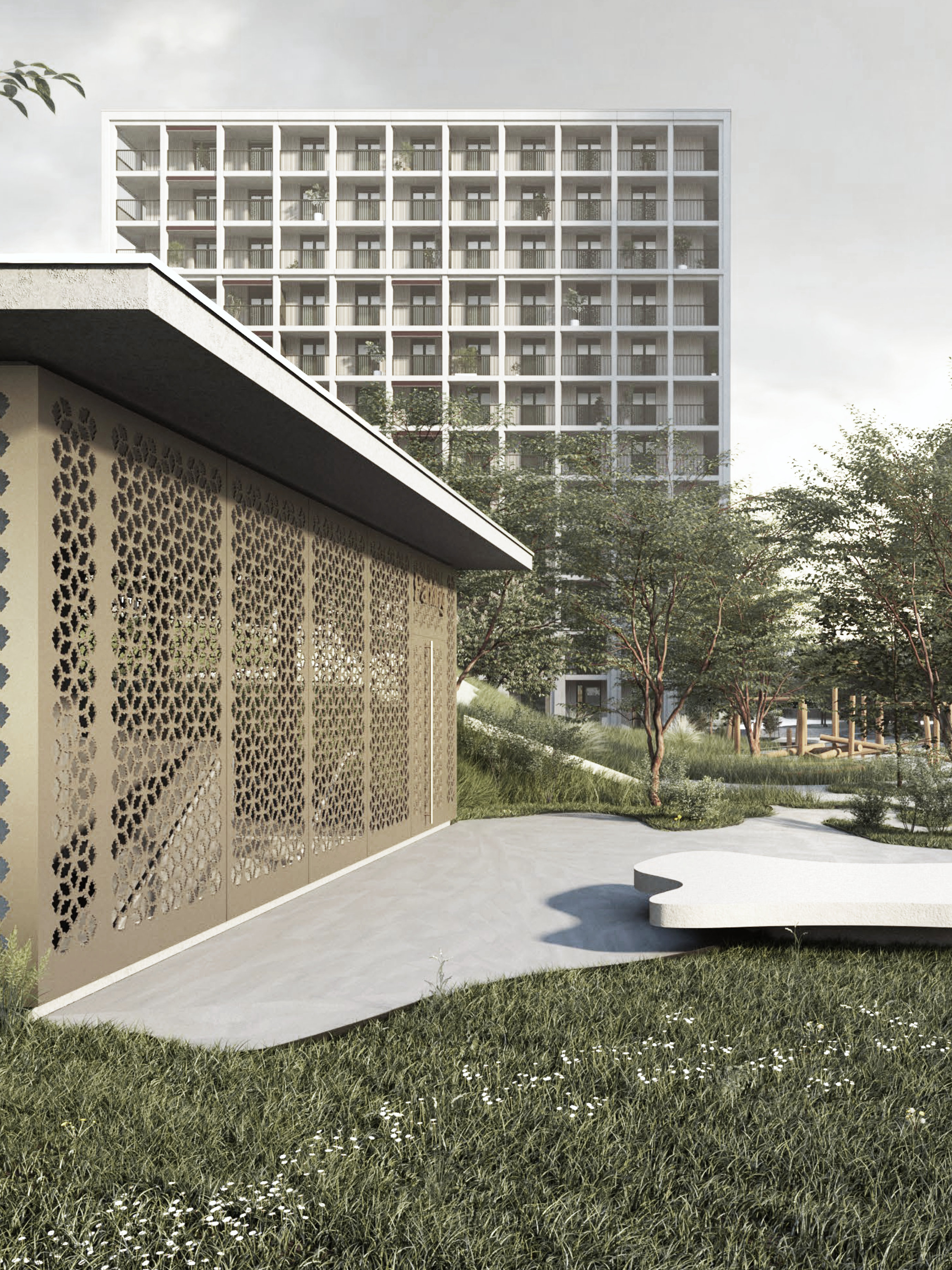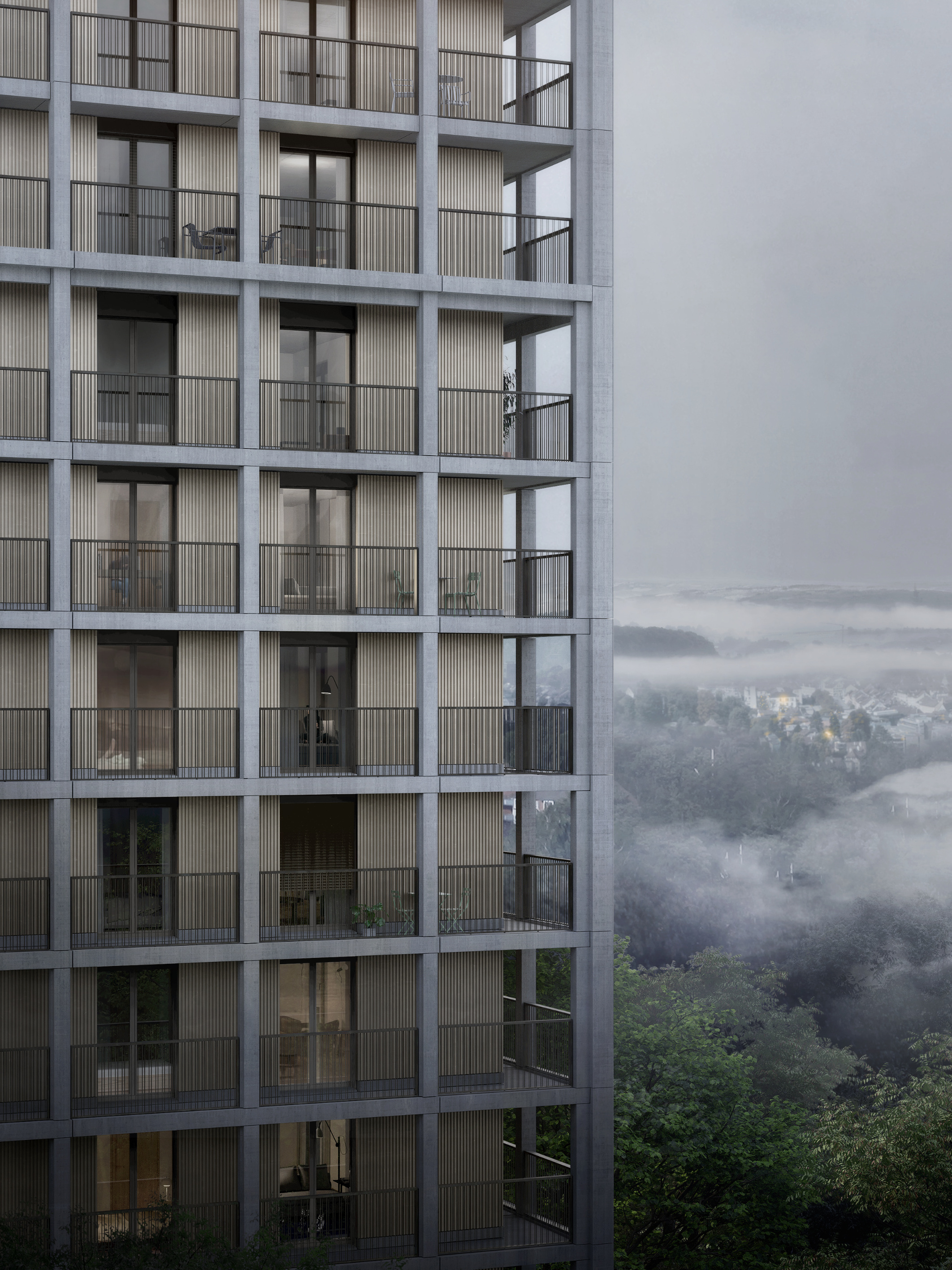 Baufeld C liegt im Nordosten des Areals, wo das Gelände stark ansteigt. Quer zum Hang entsteht dort ein langgestrecktes Wohnhaus. Auf den unteren Stockwerken verschmilzt es mit dem Terrain, um sich dann davon zu lösen und bis auf eine Höhe von 35 Metern anzuwachsen. Das Haus enthält sechzig Mietwohnungen sowie Gewerbe im Sockelgeschoss. Eine Besonderheit stellt die rundum laufende Balkonschicht dar, die aus allen Räumen zugänglich ist und den Ausdruck des Gebäudes wesentlich prägt. Präzise gefügte, vorfabrizierte Betonelemente bilden eine dreidimensionale Hülle, die die Gebäudestruktur widerspiegelt.
