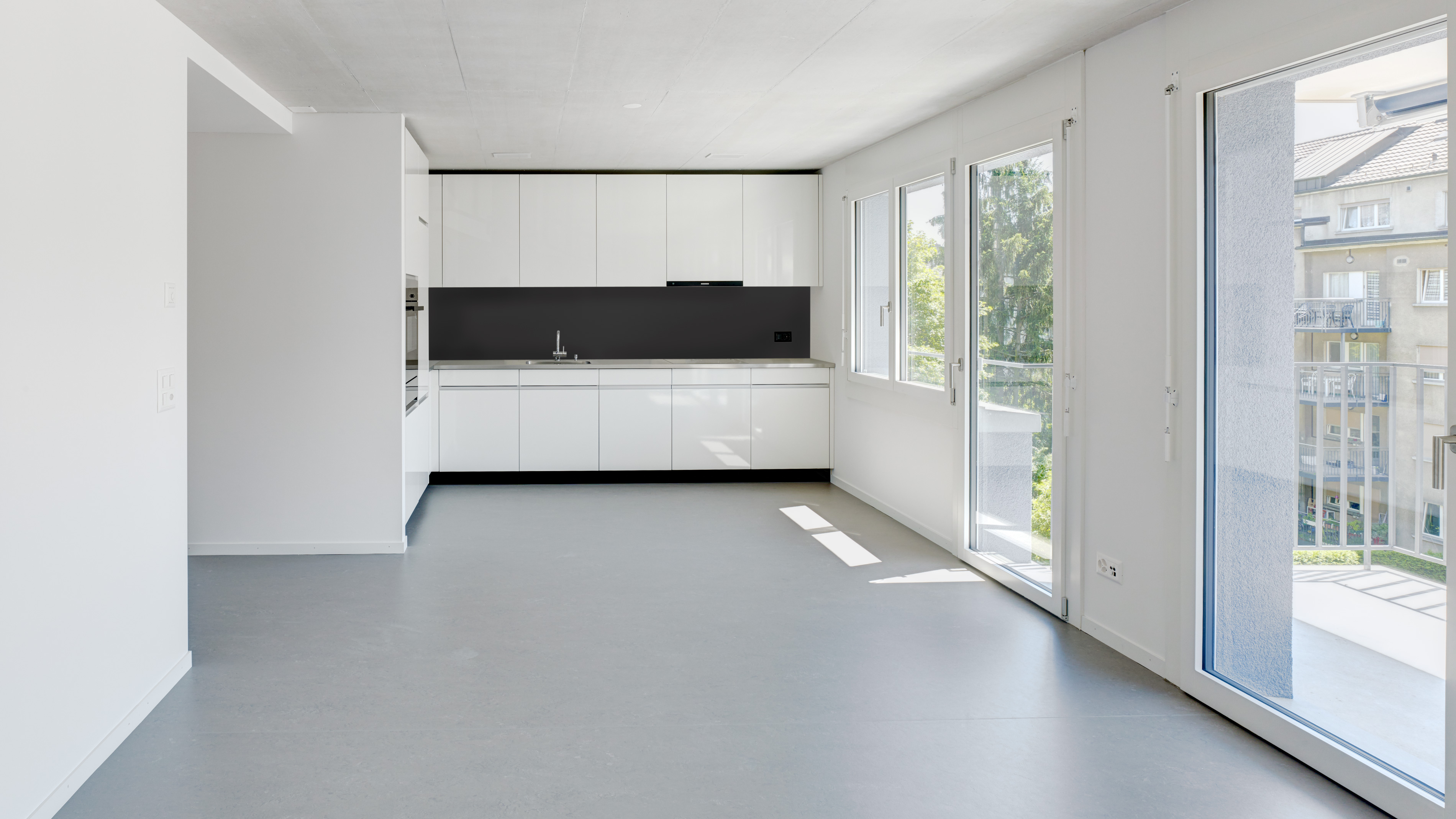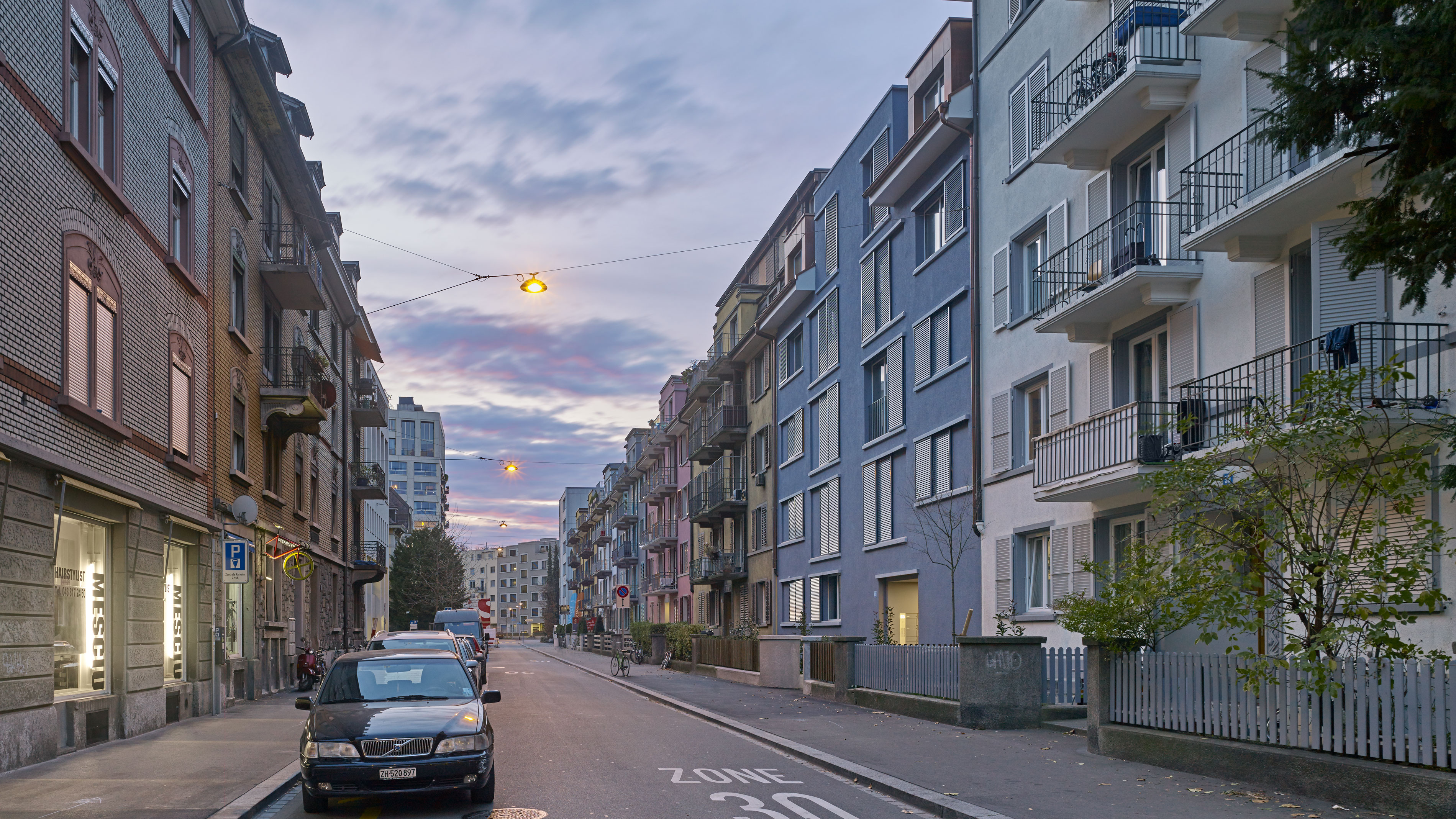 Das Mehrfamilienhaus an der Zürcher Weststrasse ist einer der ersten Neubauten, die im Zuge der Umwandlung der ehemaligen Autobahn-Transitroute zu einer Tempo 30-Zone entstanden sind. Viergeschossige Wohnhäuser aus den 1930er-Jahren prägen diesen Strassenzug – ein Bild, das es zu erhalten galt. Mit seinem grau-blauen Farbton reiht sich das Gebäude in die farbige Häuserzeile ein und lenkt erst bei näherer Betrachtung die Aufmerksamkeit auf sich. Anstelle der ursprünglichen Fensterläden aus Holz prägen Schiebeläden aus Aluminium das Fassadenbild. Sturz- und Brüstungselemente aus Faserzement schaffen einen Bezug zu den gerahmten Öffnungen und Gesimsen der Nachbarhäuser.