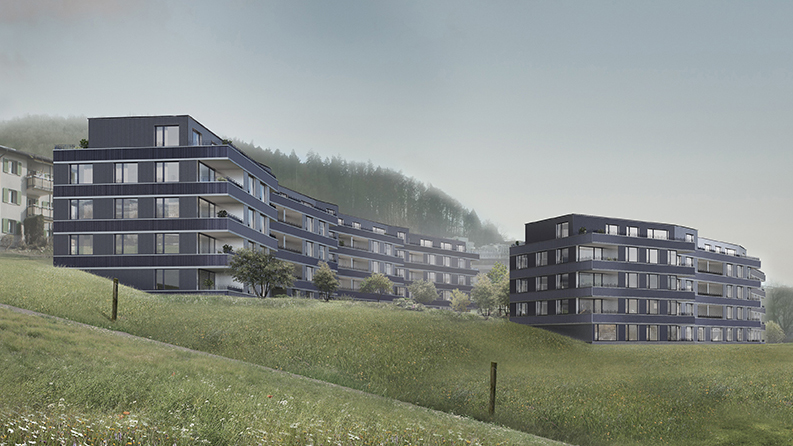 Weitläufige Grünflächen prägen das Areal im Westen der Stadt St. Gallen. Mit einer Grossform aus zwei klammerförmigen, dem Geländeverlauf folgenden Baukörpern bleibt der Landschaftsraum bewahrt und es entsteht ein durchlässiger Hofraum. Der Zutritt erfolgt über einen an der Zufahrtsstrasse gelegenen Platz im Süden. Im Norden geht der Hofraum nahtlos in die Landschaft über. Durch die Krümmung und die versetzte Anordnung der Baukörper bietet jede Wohnung einen grosszügigen Ausblick nach Westen. Die gestaffelte Anordnung der Grundrisse bricht die Grossform auf, markiert die einzelnen Hauseingänge und schafft mehrseitig orientierte Wohnungen.