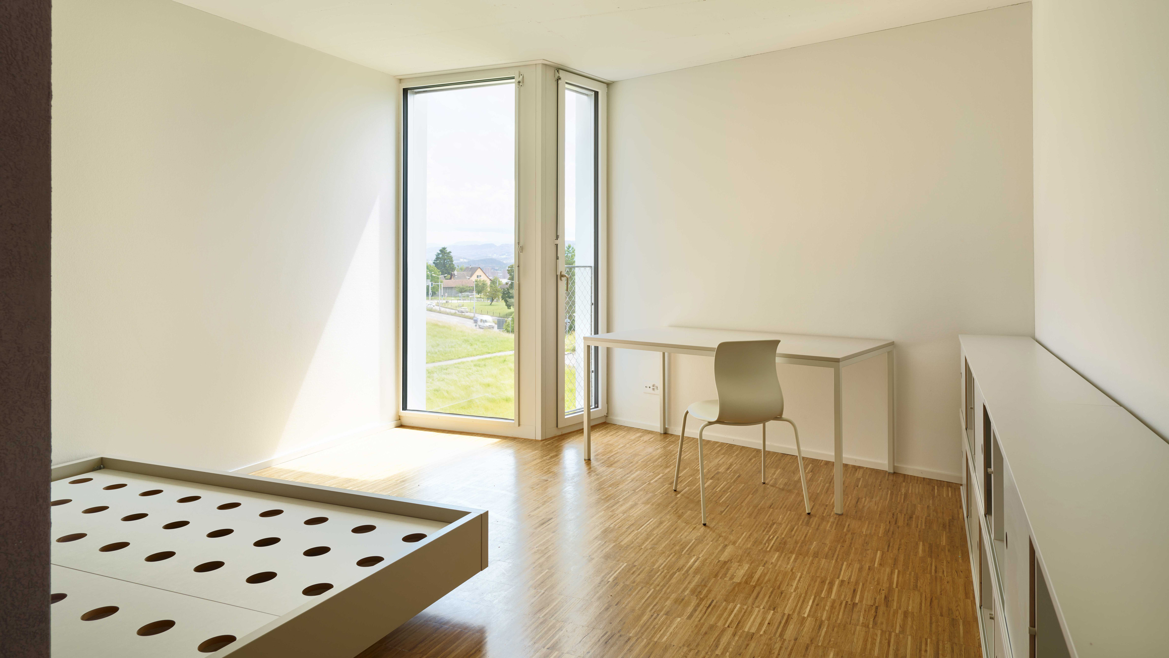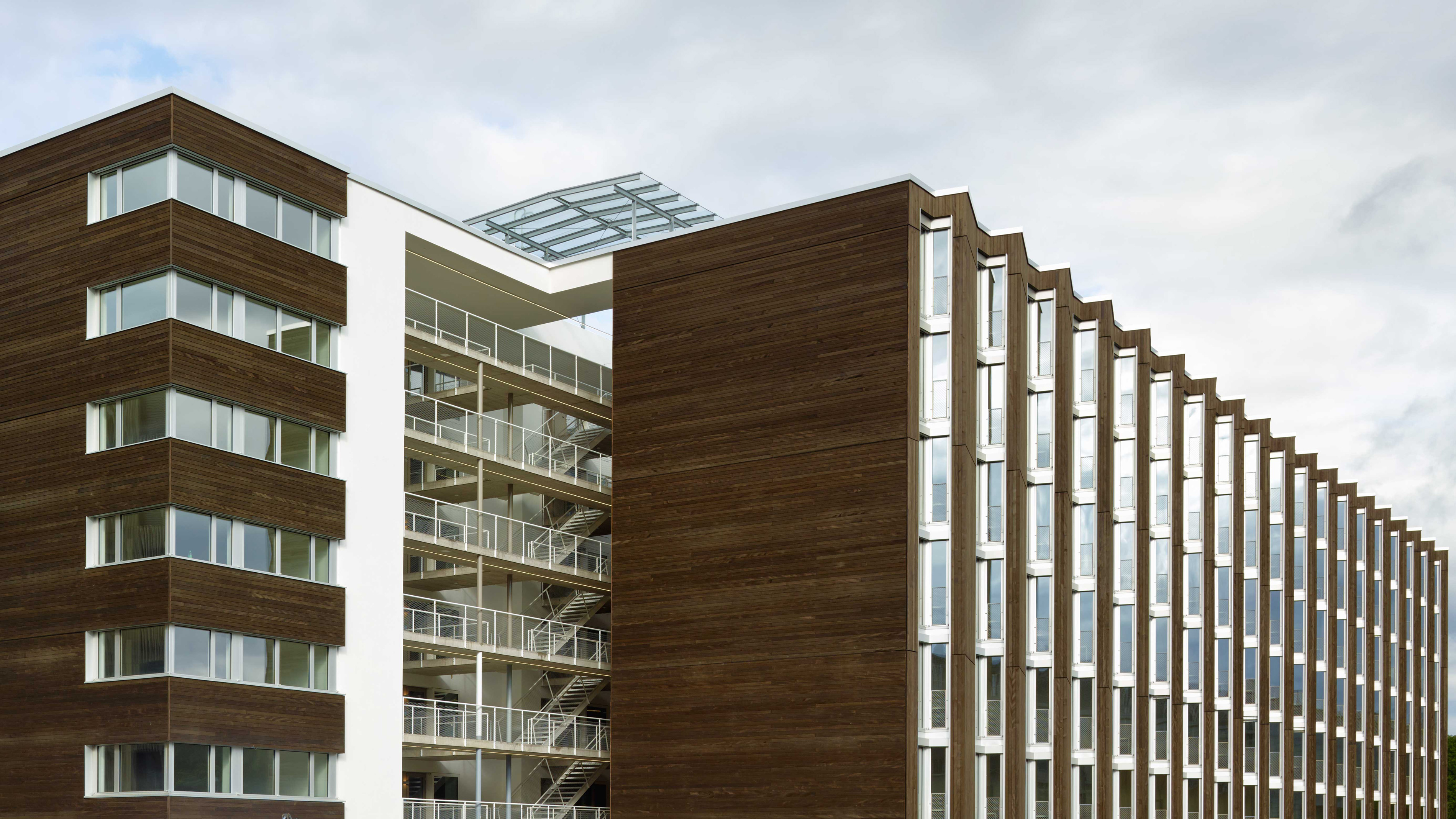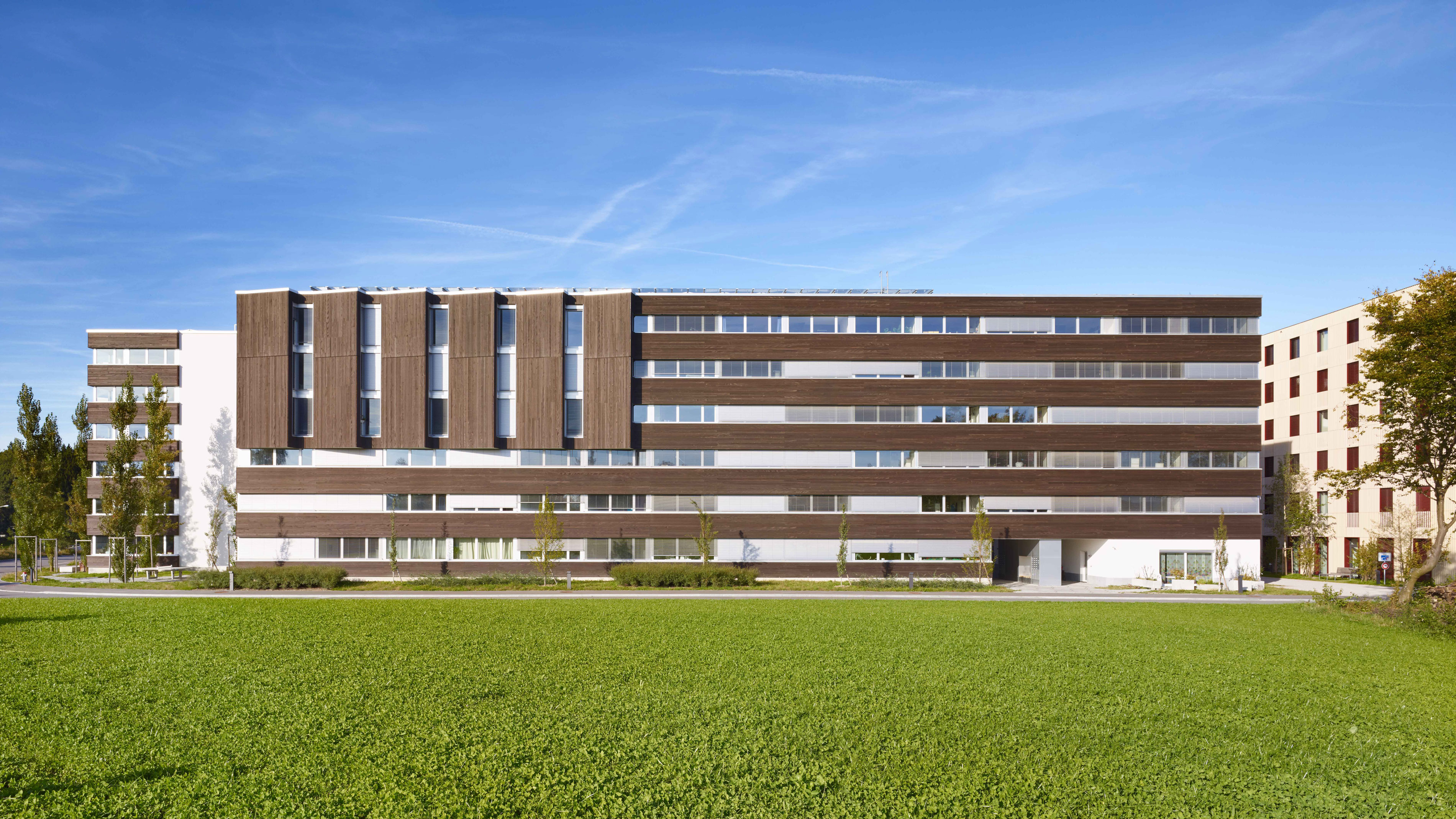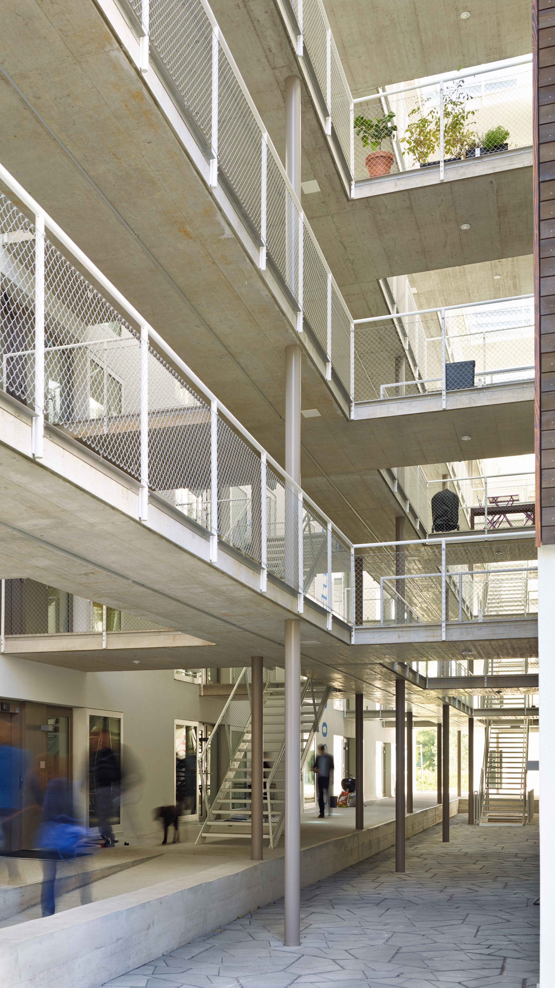 The residential complex consists of four rows running from east to west, each of which is grouped into two residences with a central access system. Stairways, footbridges and landings lead from the covered exterior space to the individual apartments. They also serve as balconies and meeting places. The apartments are all based on the same individual cell, each of which has its own bathroom and is integrated into a shared flat. From the campus to the open landscape, the density and height of the six- and seven-storey buildings gradually diminishes. Depending on the alignment, the façades either feature a shade-optimised window band or a saw blade-shaped configuration that provides noise-protection and privacy.