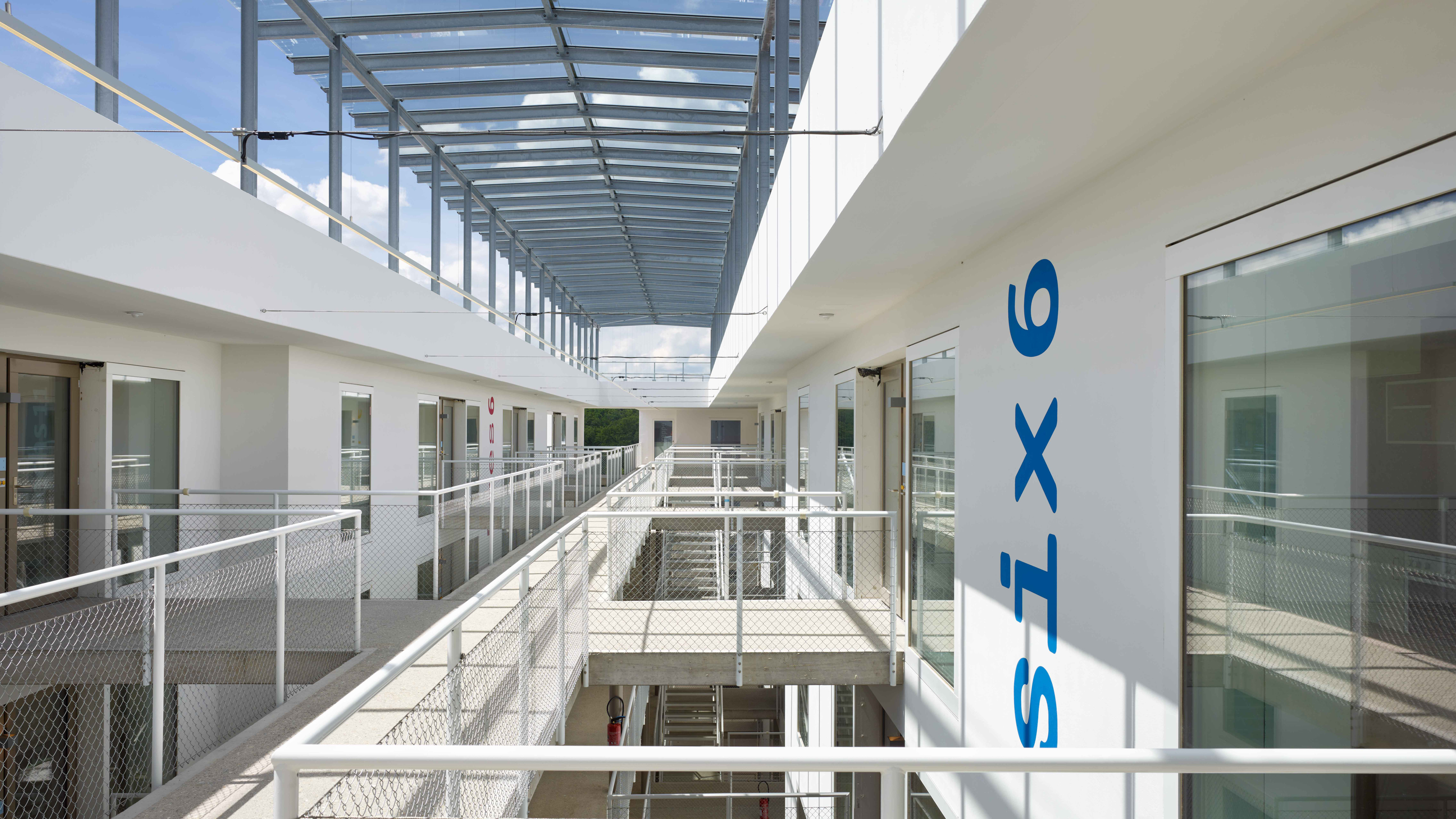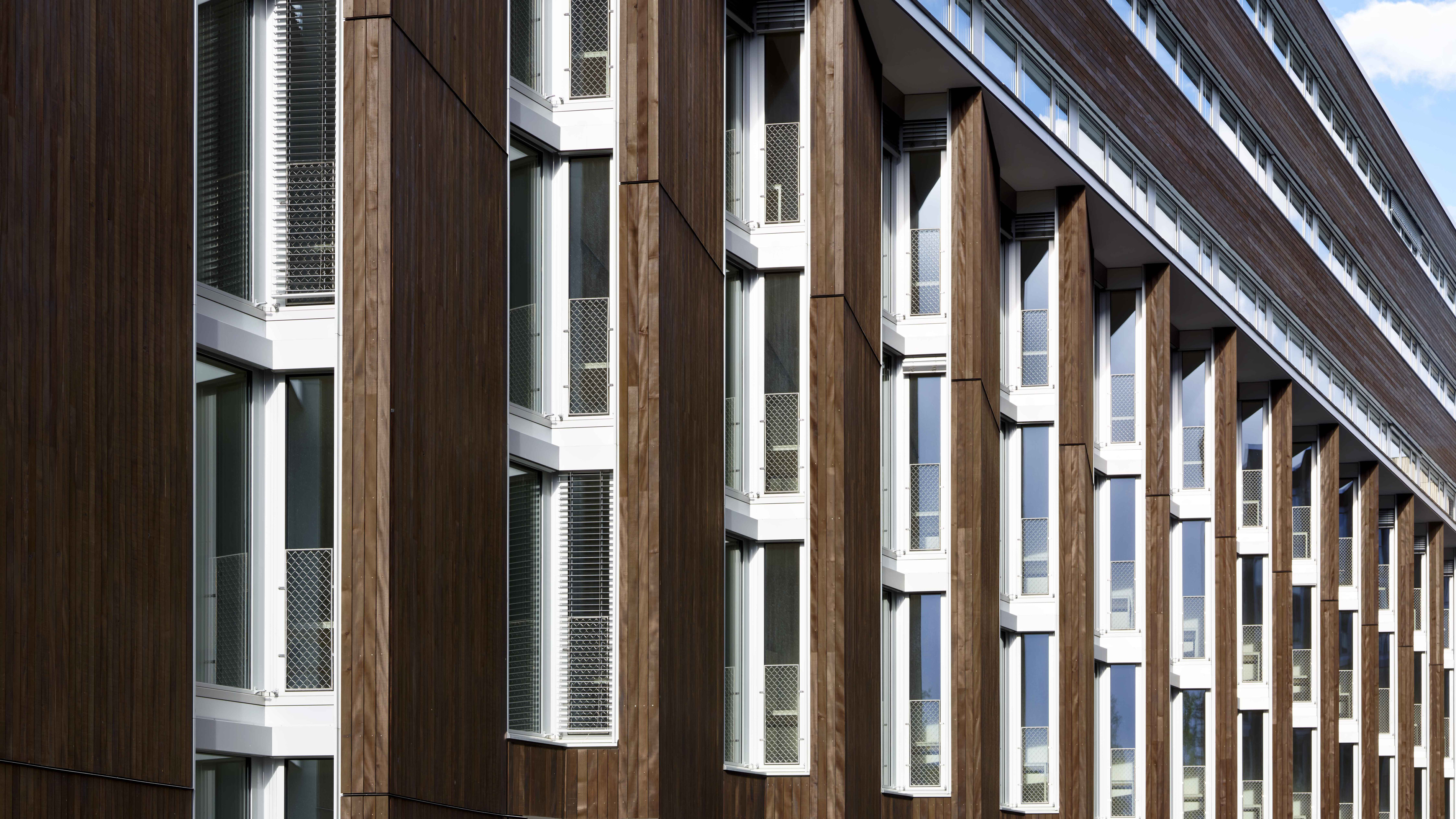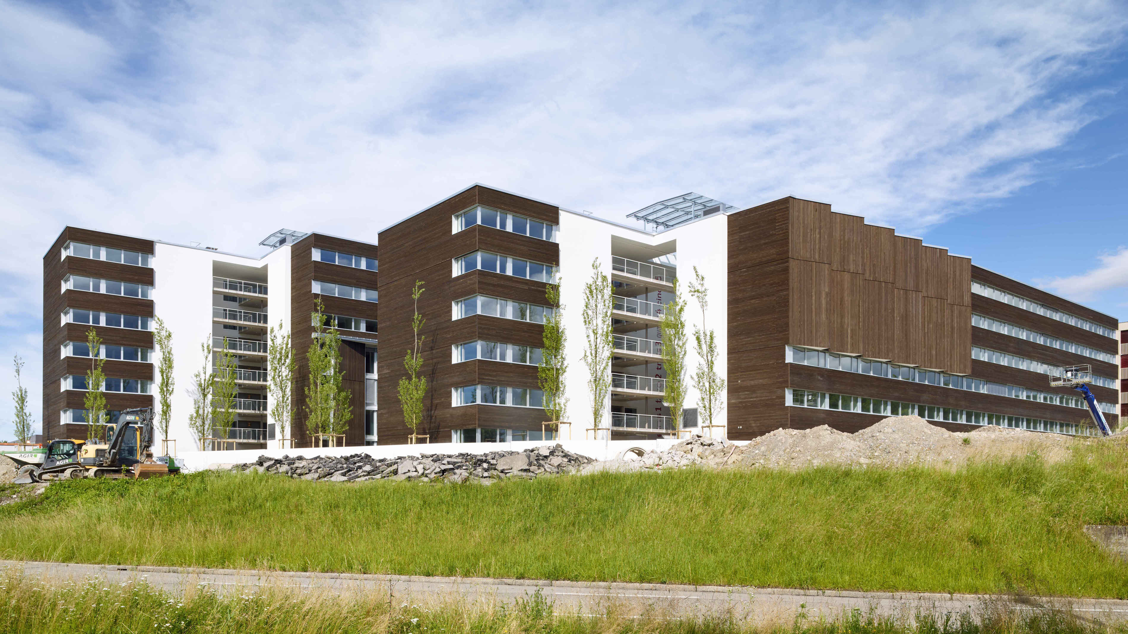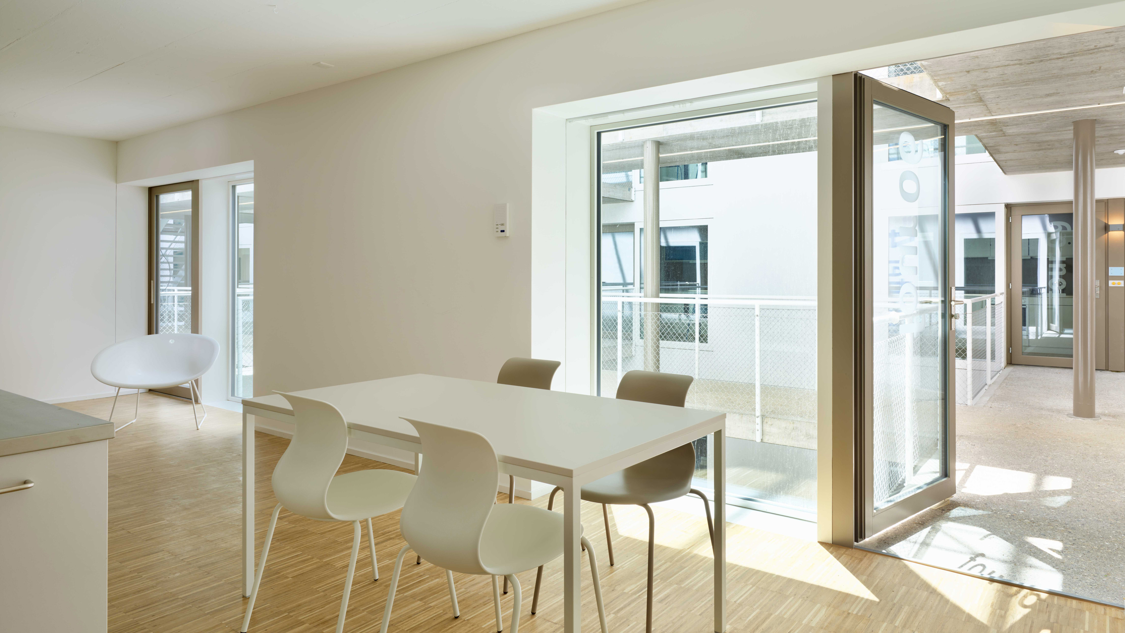The residential complex consists of four rows running from east to west, each of which is grouped into two residences with a central access system. Stairways, footbridges and landings lead from the covered exterior space to the individual apartments. They also serve as balconies and meeting places. The apartments are all based on the same individual cell, each of which has its own bathroom and is integrated into a shared flat. From the campus to the open landscape, the density and height of the six- and seven-storey buildings gradually diminishes. Depending on the alignment, the façades either feature a shade-optimised window band or a saw blade-shaped configuration that provides noise-protection and privacy.