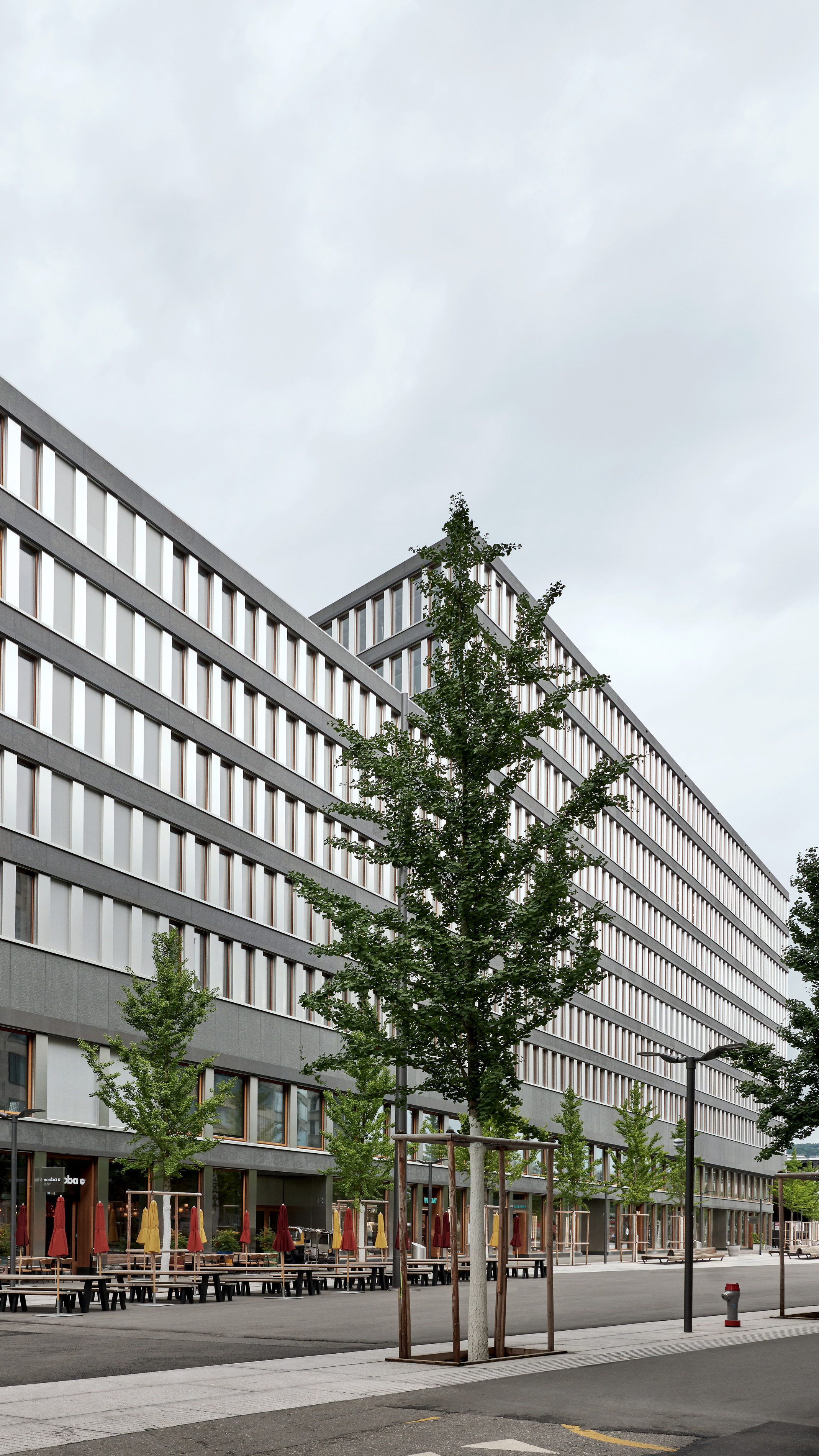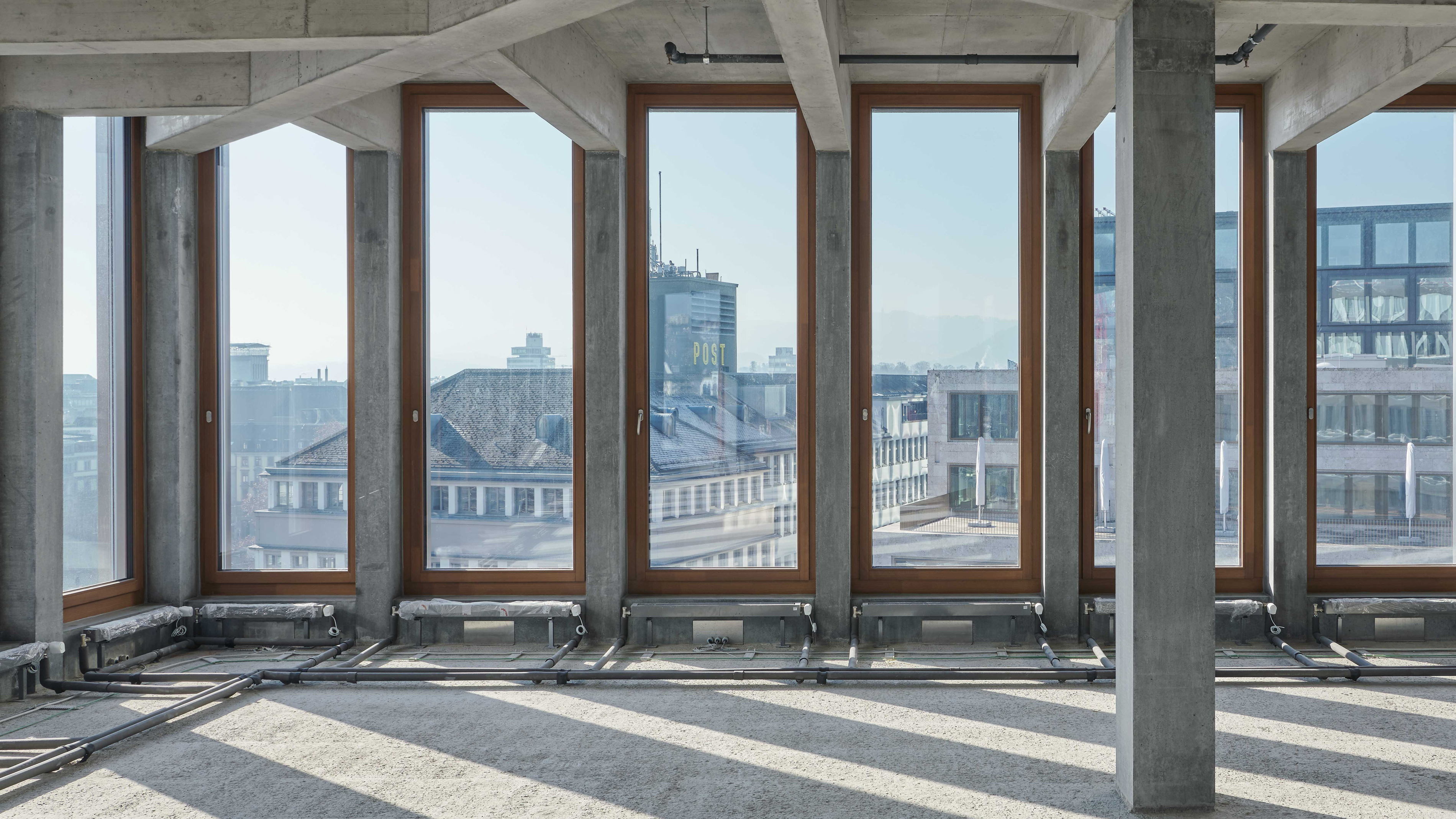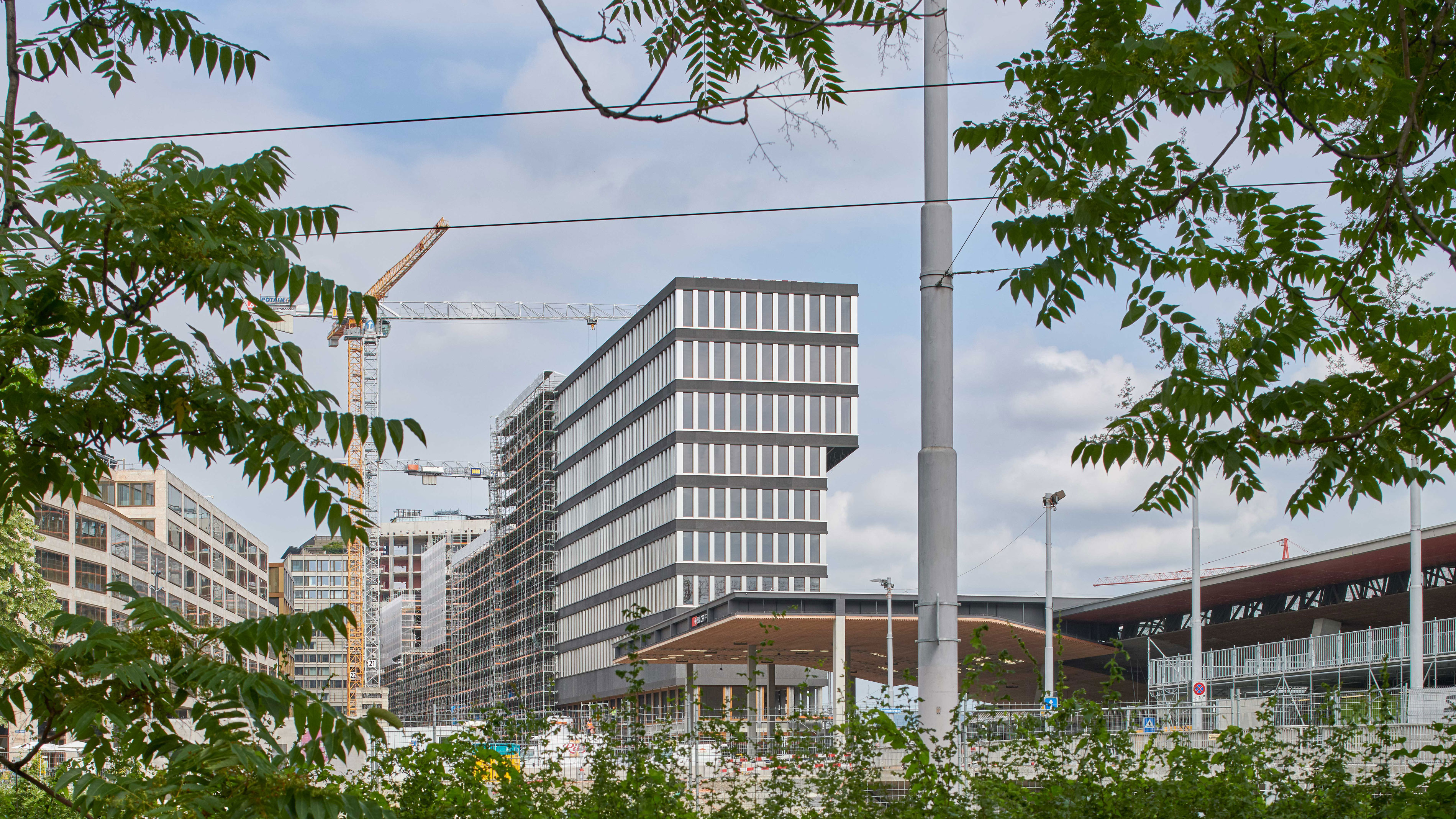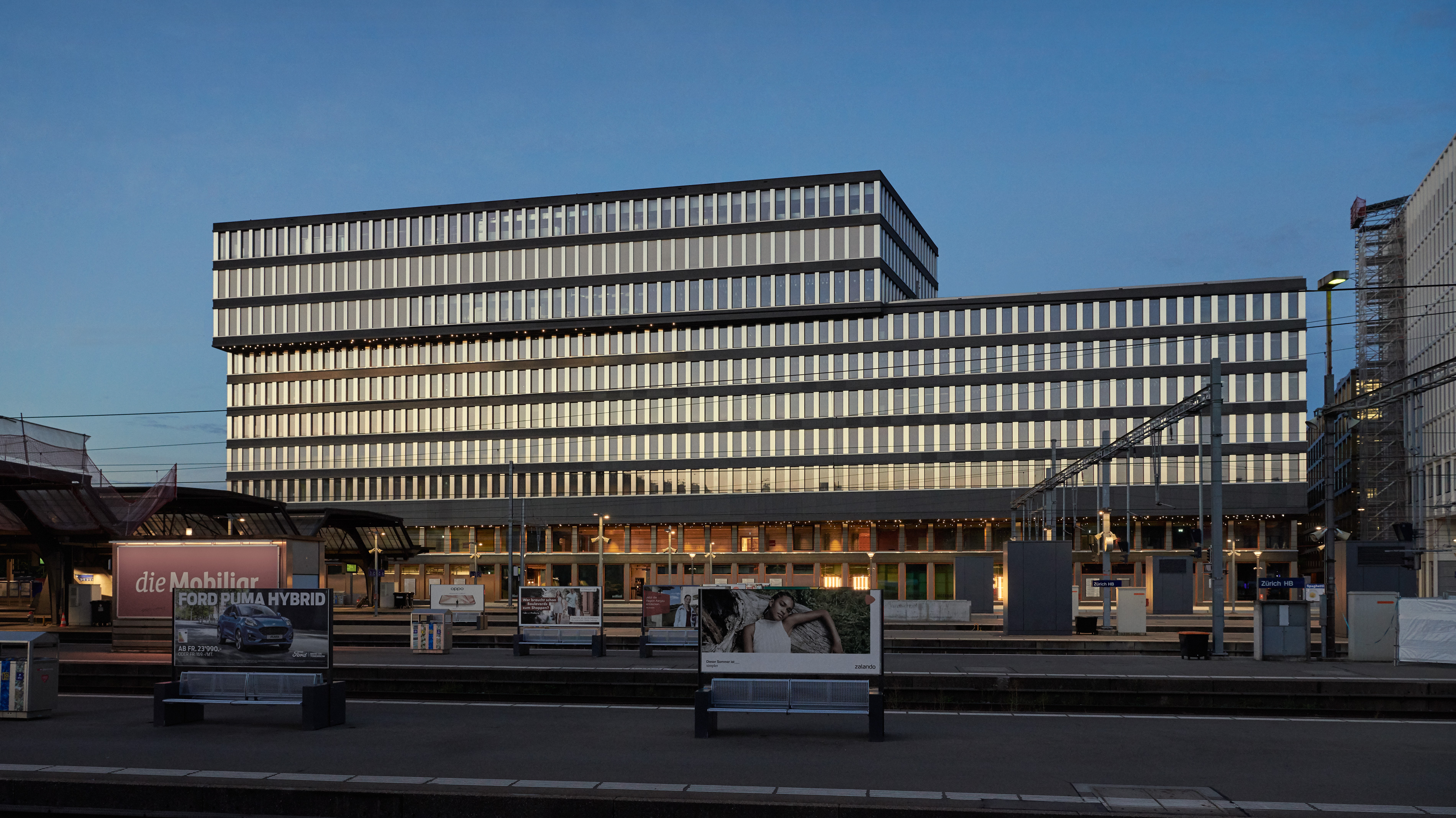 Together with the University of Teacher Education, the office and commercial centre forms the starting point of the new Europaallee district. Erected between the railway tracks and Europaplatz, the narrow building rises into a ten-storey frontage structure at its head on the square. The façade features a repetitive structure, with a dynamic grid pattern on the transition to the two base storeys, where heavy-duty girders absorb the weight of the upper storeys. The overhang above Europaplatz accentuates the retail and restaurant spaces at street level. The second overhang along the railway tracks evokes, much like a signal box, the perpetual dynamic of trains coming and going.