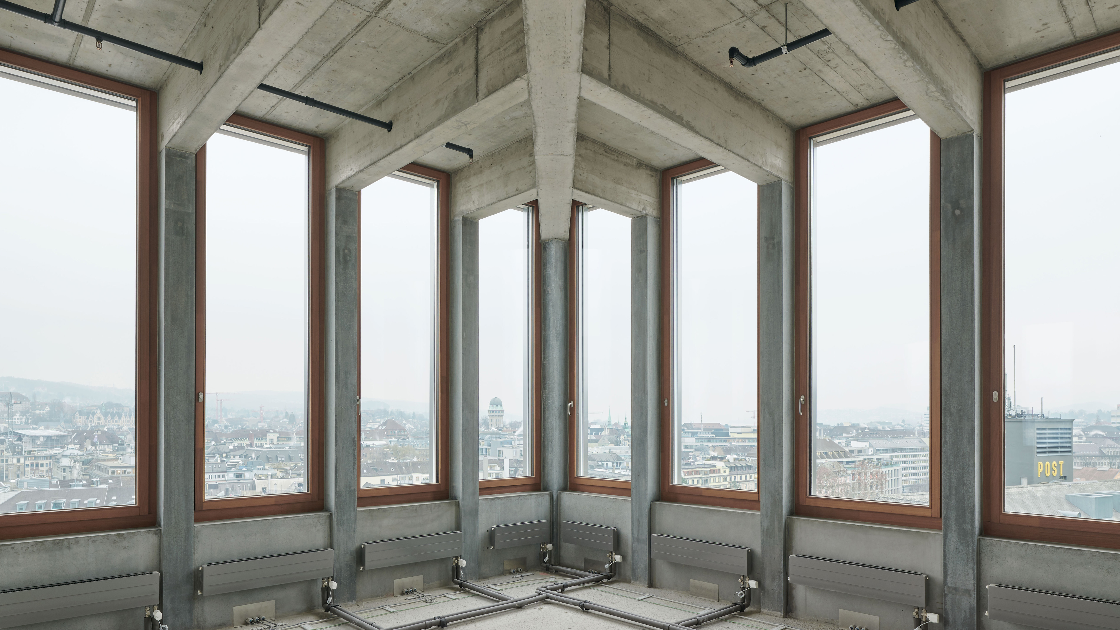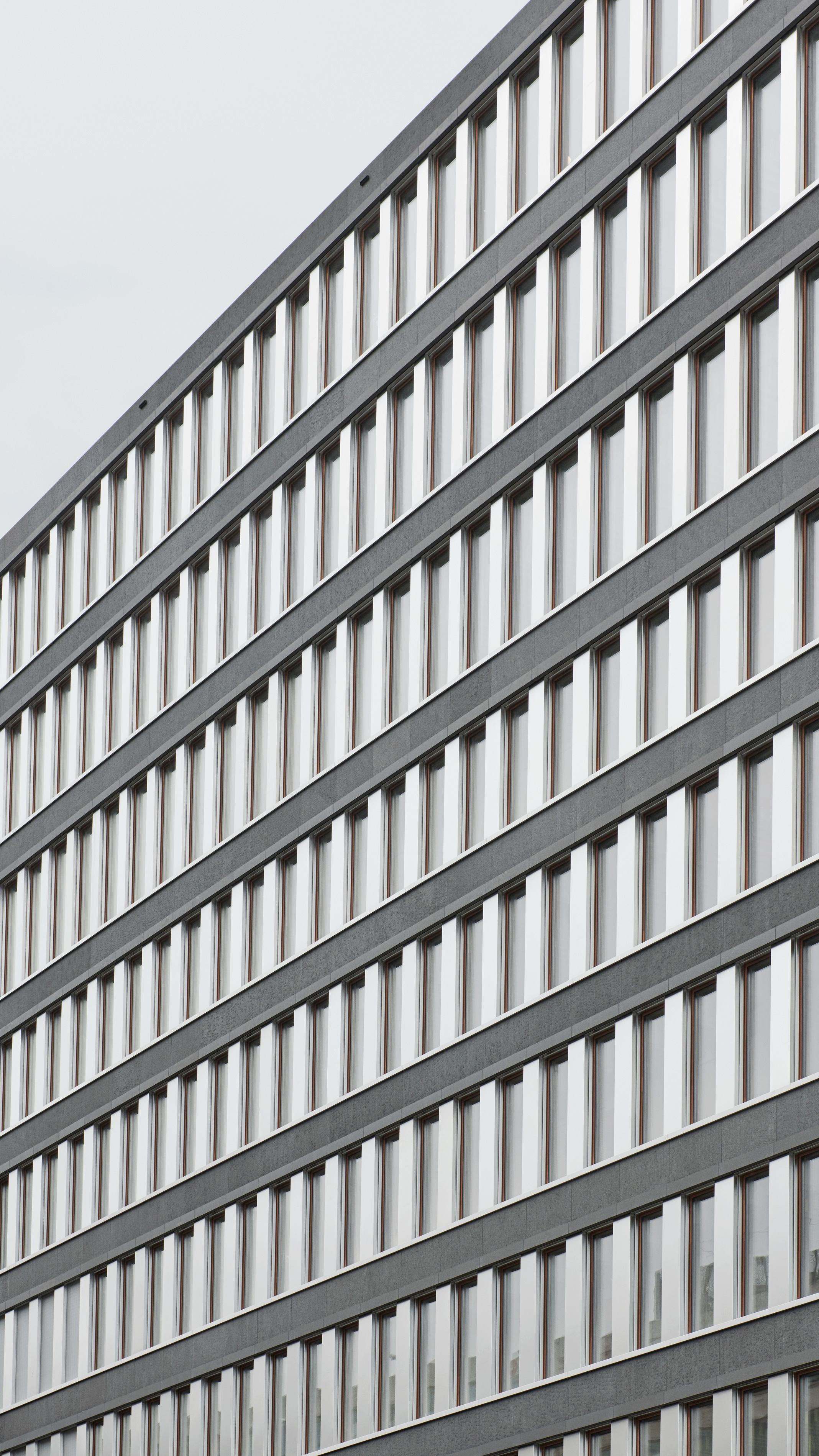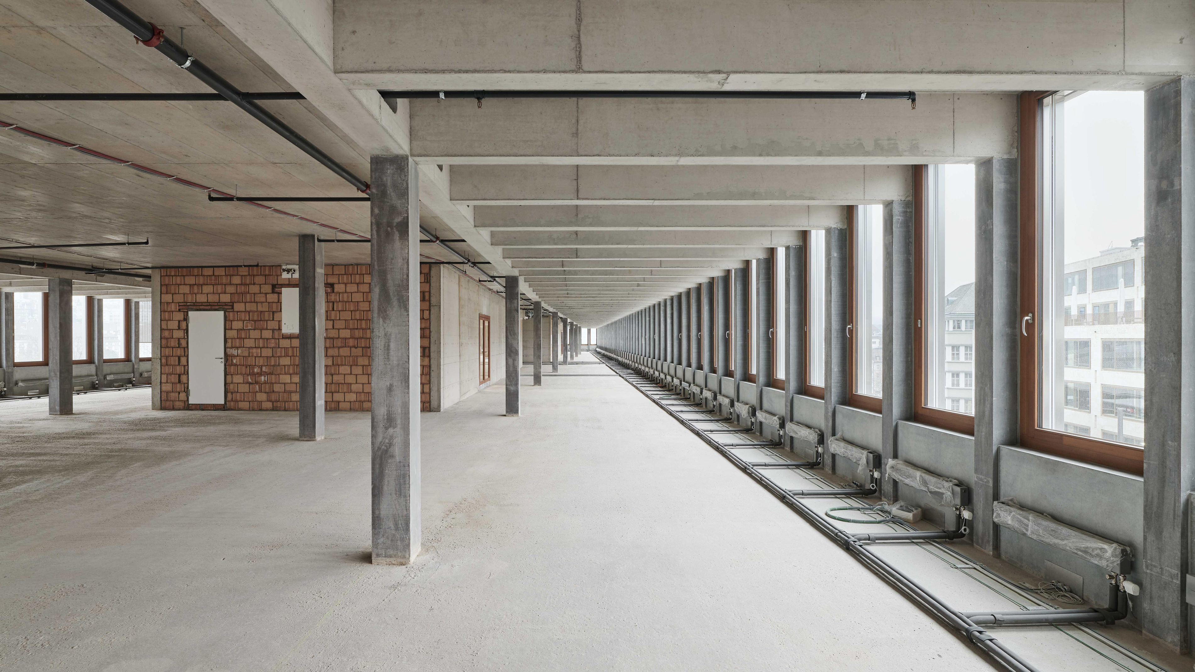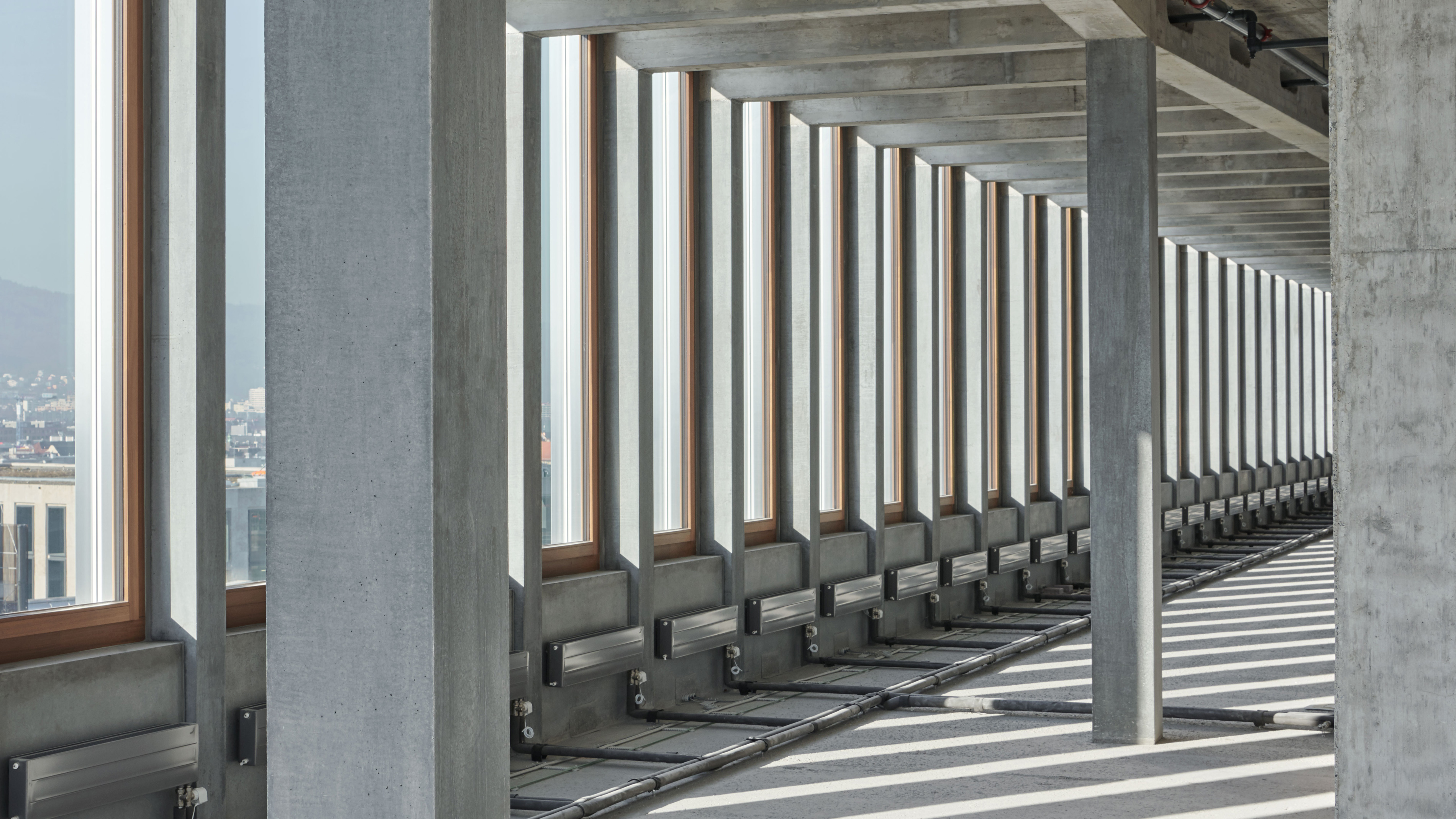 Together with the University of Teacher Education, the office and commercial centre forms the starting point of the new Europaallee district. Erected between the railway tracks and Europaplatz, the narrow building rises into a ten-storey frontage structure at its head on the square. The façade features a repetitive structure, with a dynamic grid pattern on the transition to the two base storeys, where heavy-duty girders absorb the weight of the upper storeys. The overhang above Europaplatz accentuates the retail and restaurant spaces at street level. The second overhang along the railway tracks evokes, much like a signal box, the perpetual dynamic of trains coming and going.