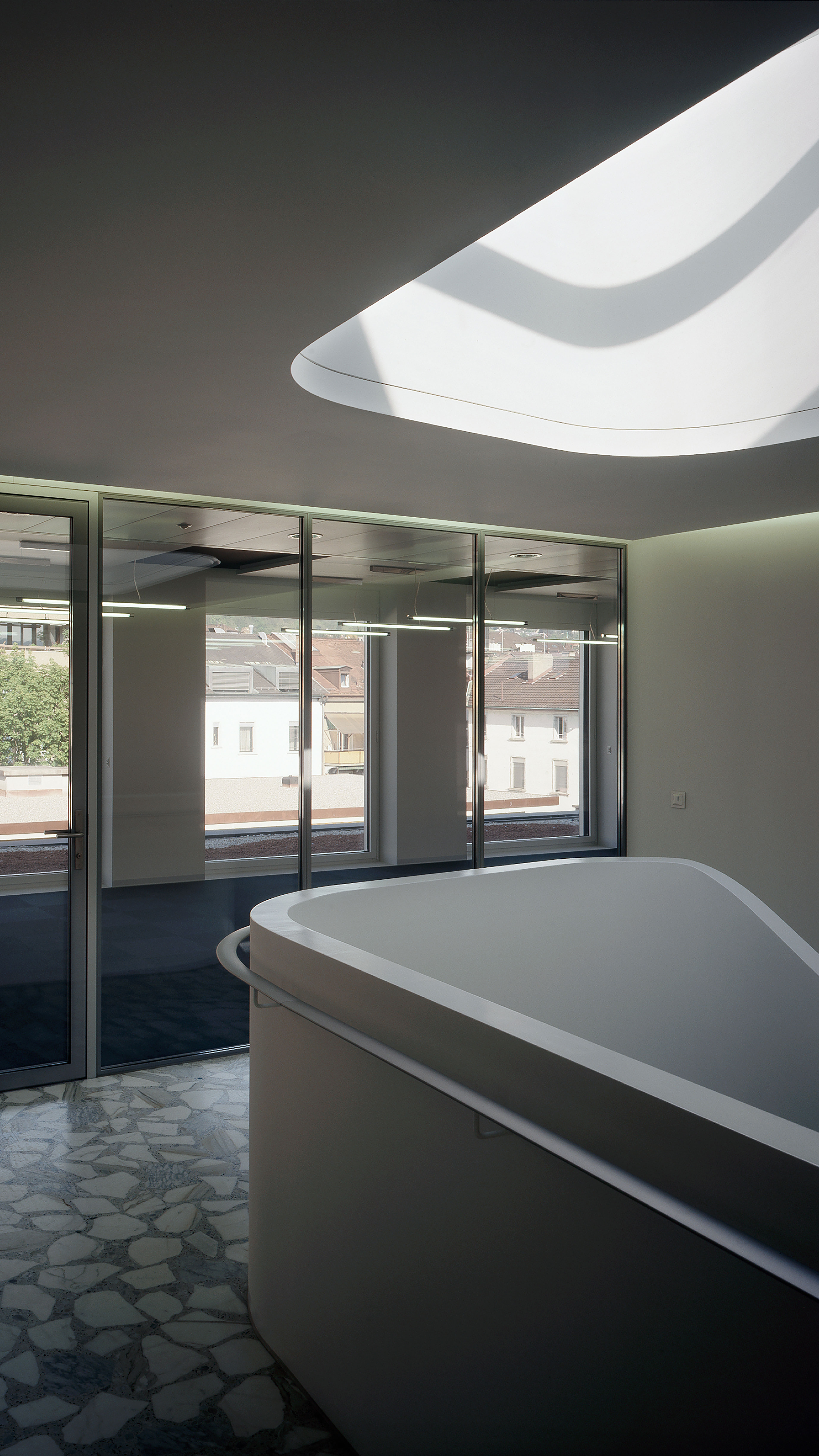The two properties from 1961 and 1973 were restored and merged together to form a new office building. This involved aligning floor heights, load-bearing structures and access areas. An additional stairway was built in order to meet requirements for escape routes and earthquake resistance. This also guarantees flexible distribution of space. The two buildings have also been merged together on the exterior and attest to the simultaneous and extensive conversion. Prefabricated elements fit together to form a punctuated façade. Only the different window formats remain as a reference to the past.