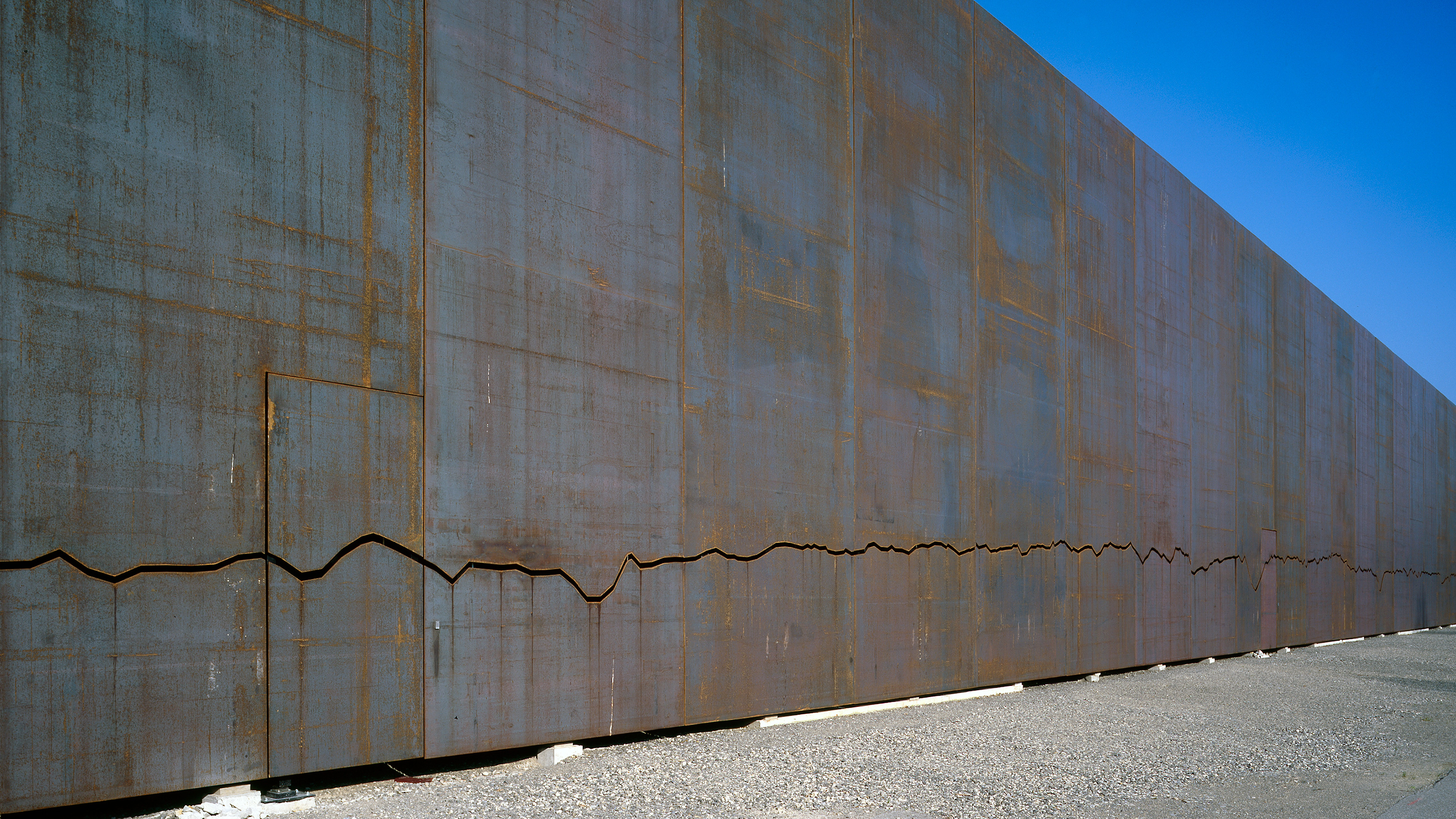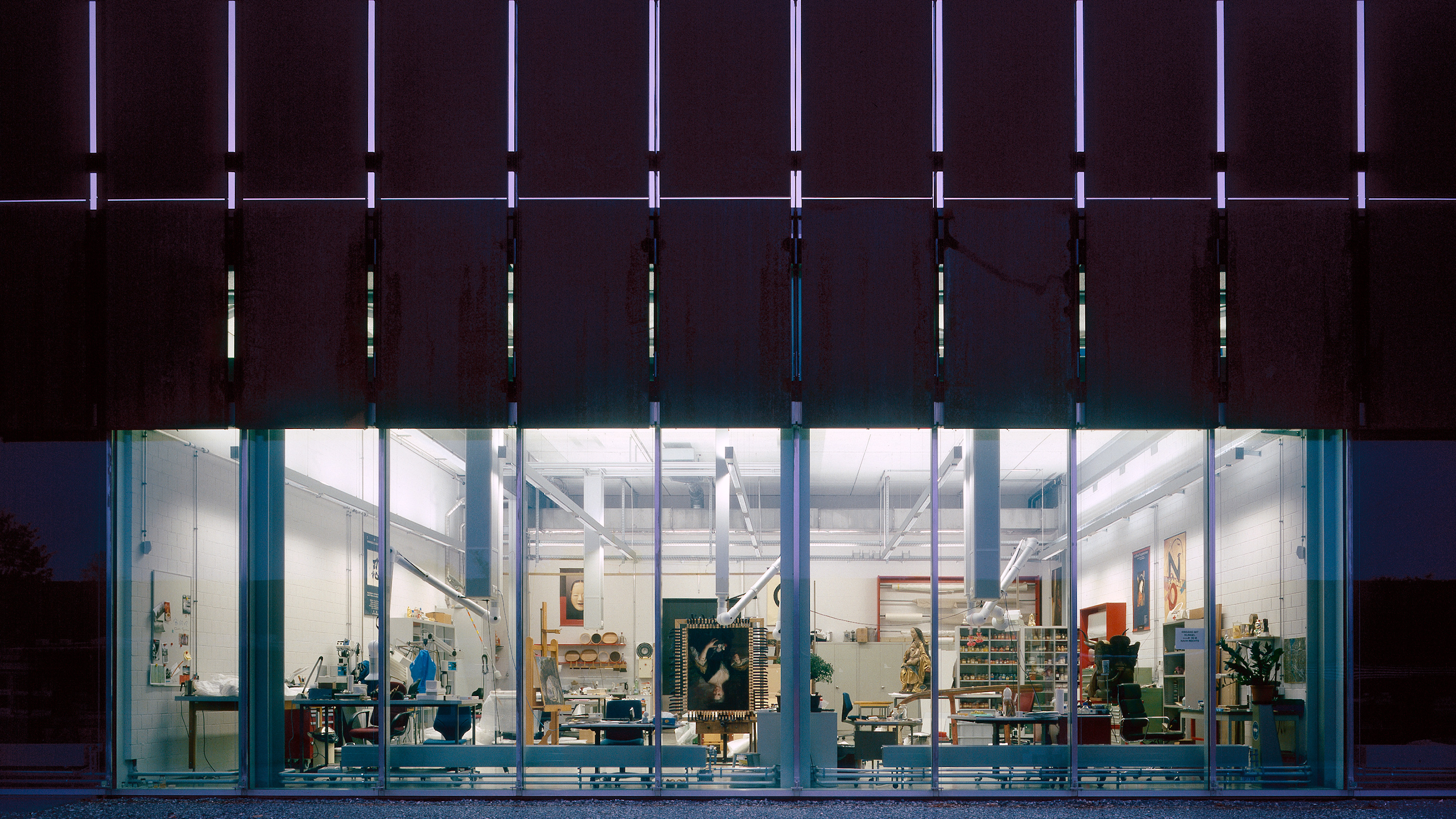 The three existing arsenal halls and their courtyards now form a standalone complex with a new function. It houses an object centre for storing the collection, plus conservation and restoration studios, a material analysis laboratory and a service centre. The structures are linked via a corridor that simultaneously encloses the complex. The untreated steel plates in the new façade signal the change of purpose. In the object centre, a jagged joint represents the topographical altitude profile along the Swiss border. This joint, which is an integral structural element, symbolises the wealth of Swiss culture contained within the building.