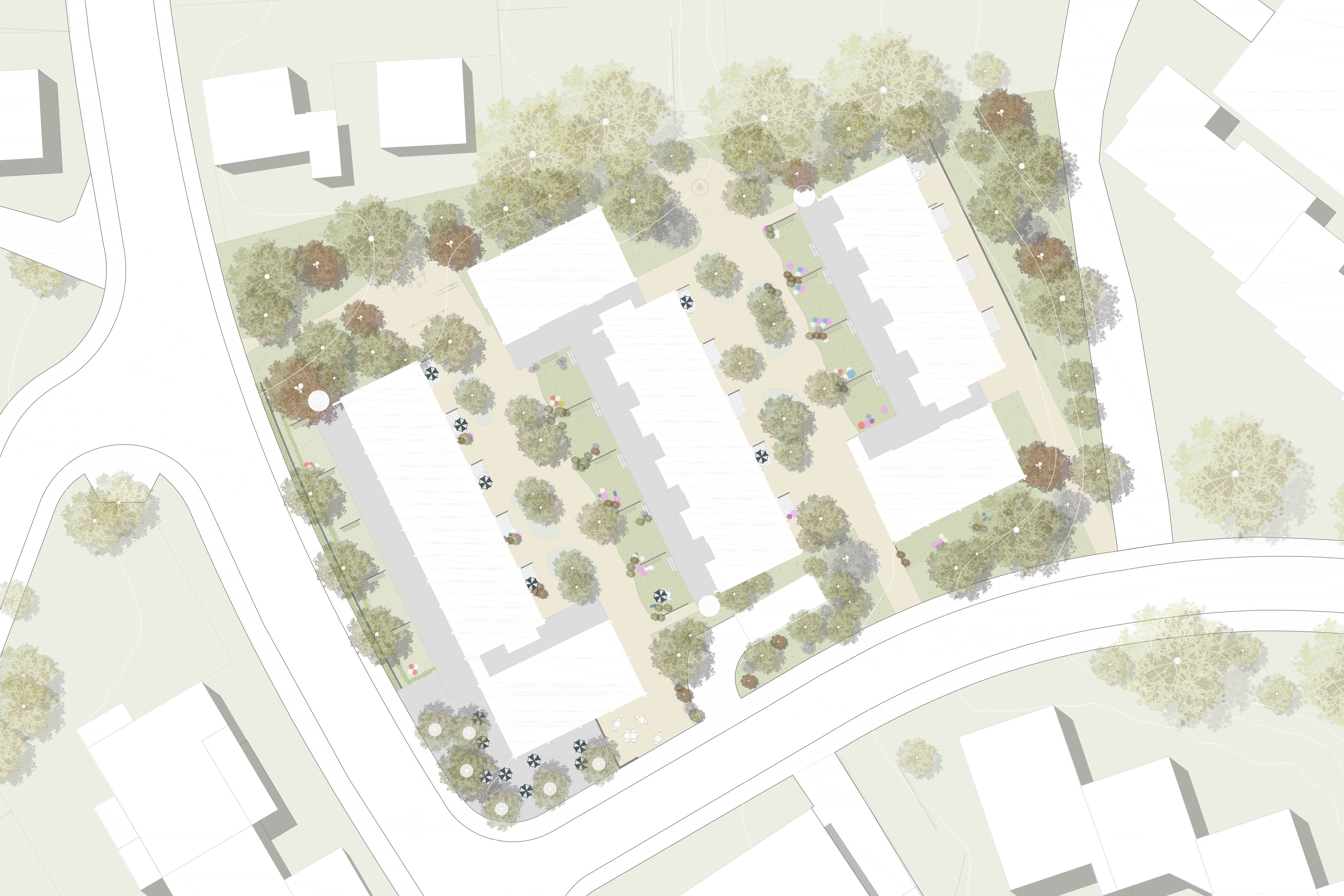 The site is located on the northern edge of the town of Gossau. The three longitudinal structures are set parallel to the contour lines of the terrain, which slopes down towards the west, and are each complemented by a head-end building. The topography also influences the diverse flat typologies, which include compact studio, maisonette and multi-storey flats with 1.5 to 5.5 rooms. A total of fifty per cent of the flats have a direct connection to the adjacent green space. This provides a visually and atmospherically attractive environment that allows for a variety of uses and links up with the open spaces in the neighbourhood.